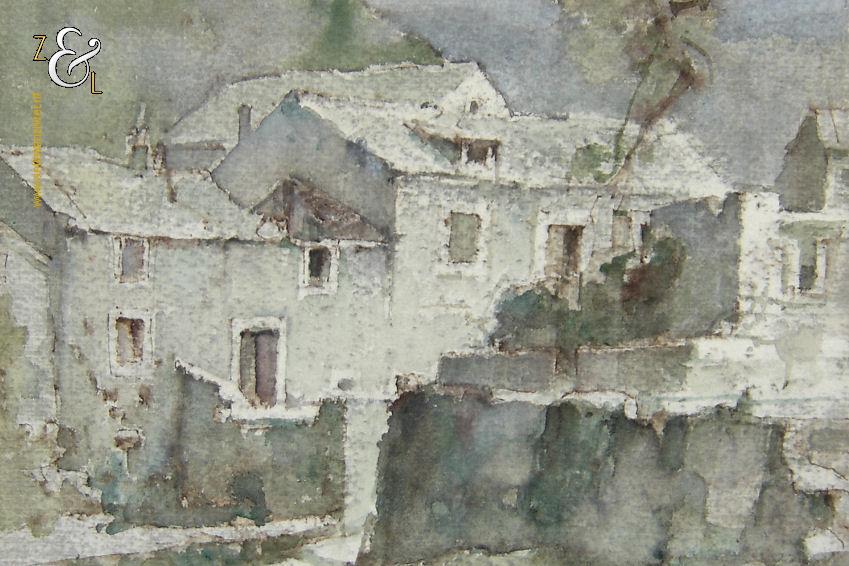 Deze aquarel met de afbeelding van een wit dorp in de bergen is gemaakt door Roelof Klein. Hij heeft deze aquarel op vakantie gemaakt in het plaatsje Pitve op het eiland Hvar Kroatië (voormalig Joegoslavië). De aquarel is aan de voorzijde linksonder met aquarelverf gesigneerd: Roelof Klein. Op de achterzijde staat linksonder in potlood : Roelof Klein Pitve Yoegoeslavie Hvar. De aquarel is 36 cm lang bij 30 cm breed.