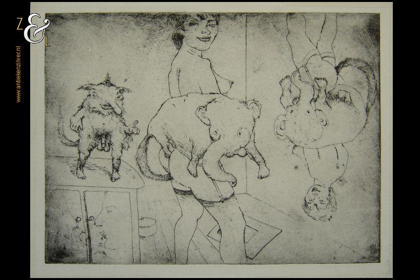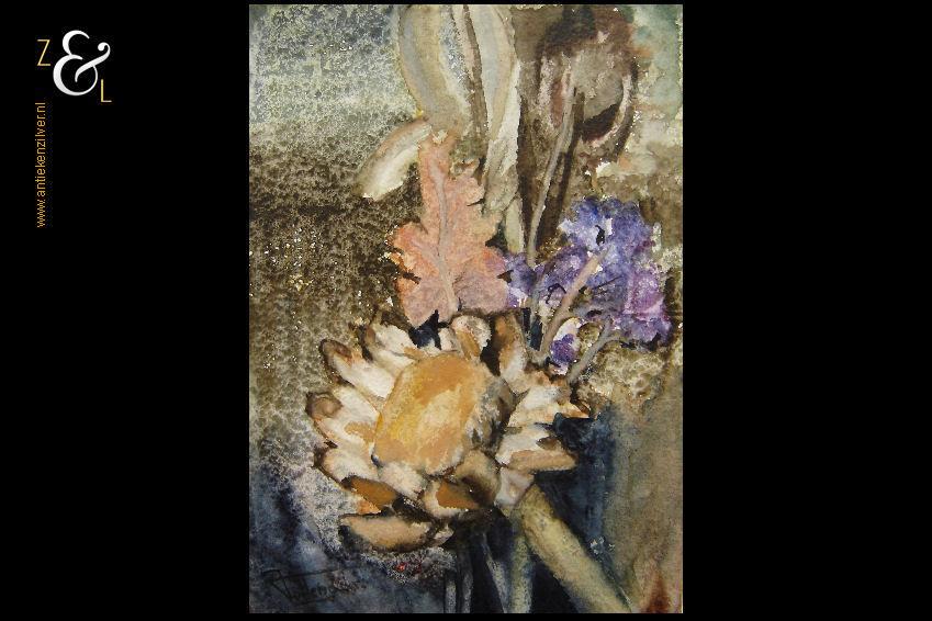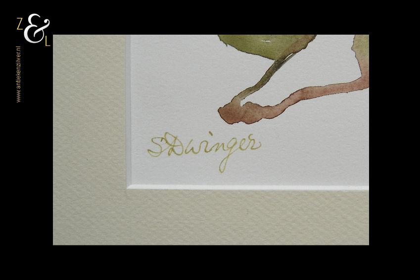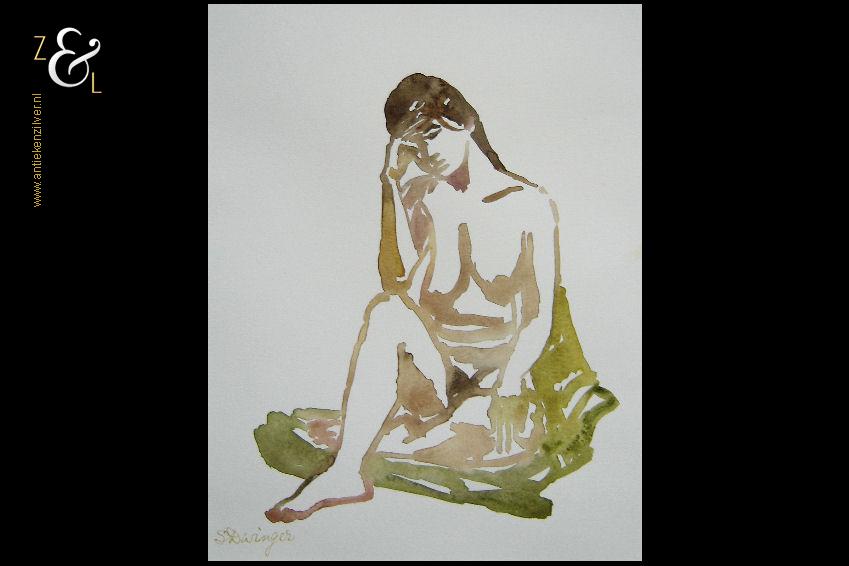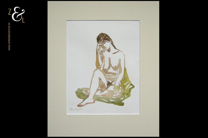 Deze aquarel met de voorstelling naaktfiguur van een zittend meisje is gemaakt door Sonja Dwinger. De aquarel is linksonder gesigneerd S. Dwinger en is aan de binnenzijde van het passe partout gemeten 26.6 cm lang bij 20.8 cm breed, de buitenzijde van het passe partout is 39.8 cm lang bij 33 cm breed.