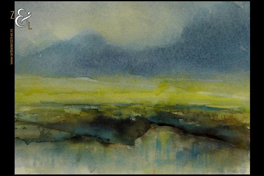 Deze aquarel met de titel “Duinlandschap” is gemaakt door Willie van Haard. De aquarel is in potlood rechtsonder gesigneerd en gedateerd Willie van Haard ’13. De aquarel is gemeten aan de binnenzijde van het passe partout 29.8 cm lang bij 21.7 cm breed. De buitenzijde van het passe partout is 49 cm lang bij 39.5 cm breed.