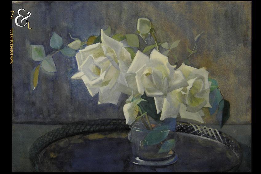 Deze aquarel met de voorstelling van witte rozen in een 18e-eeuws glas op een zilveren blad is gemaakt door een voor ons nog onbekende kunstenaar. De aquarel die niet gesigneerd is heeft een hoog niveau waaraan men kan zien dat deze geschilderd is door een volleerd kunstenaar. De aquarel is 35 cm lang bij 25 cm breed.