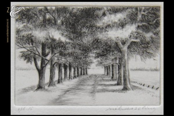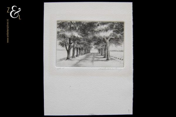 Droge naald gravure gemaakt door Riek Wesseling met de afbeelding van een bomenlaantje. De droge naald gravure die zij vermoedelijk in Amsterdam (waar zij vanaf 1950 woonde) gemaakt heeft, is rechtsonder met potlood gesigneerd: Riek Wesseling en linksonder staat: opl. (oplage) 15. De droge naald gravure meet aan de buitenzijde 14.9 cm bij 11.7 cm de ets zelf is 9 cm bij 6 cm groot.