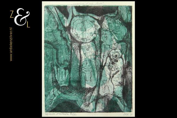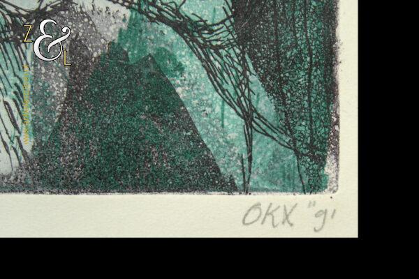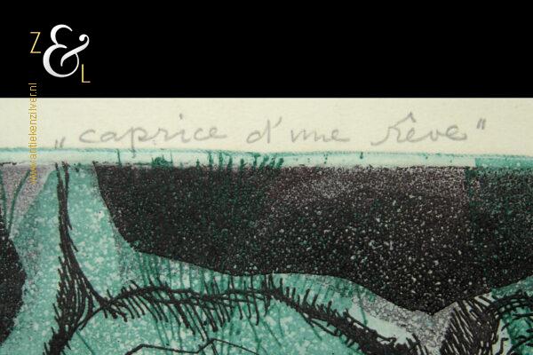 Deze ets / aquatint is gemaakt door Kees Okx. De ets / aquatint heeft in potlood middenboven de titel “caprice d’une rêve” (gril van een droom) linksonder staat de oplage épreuve d’artiste II/V en rechtsonder de signatuur met jaartal wanneer deze ets / aquatint gemaakt is OKX ’91. De ets / aquatint is aan de buitenzijde gemeten 42.8 cm lang bij 36 cm breed. De afbeelding van de ets is 36.7 cm lang bij 29.5 cm breed. De ets heeft een lichte egale verkleuring.