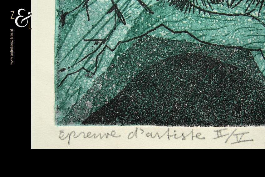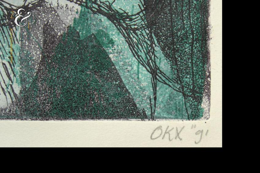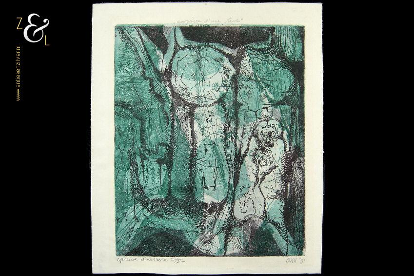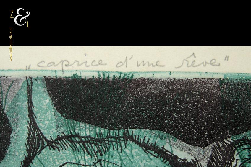 Deze ets / aquatint is gemaakt door Kees Okx. De ets / aquatint heeft in potlood middenboven de titel “caprice d’une rêve” (gril van een droom) linksonder staat de oplage épreuve d’artiste II/V en rechtsonder de signatuur met jaartal wanneer deze ets / aquatint gemaakt is OKX ’91. De ets / aquatint is aan de buitenzijde gemeten 42.8 cm lang bij 36 cm breed. De afbeelding van de ets is 36.7 cm lang bij 29.5 cm breed. De ets heeft een lichte egale verkleuring.