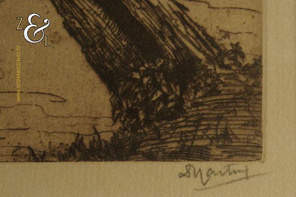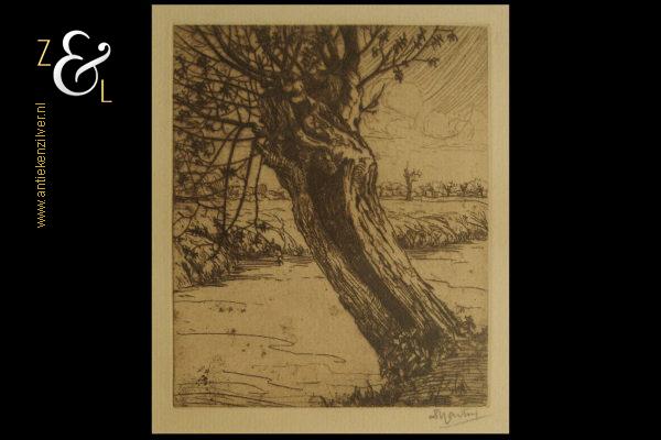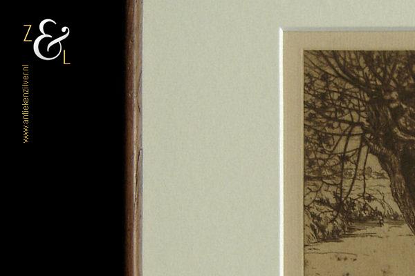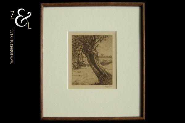 Deze ets met de voorstelling van een knotwilg aan de waterkant is gemaakt door Dirk Harting. De ets is gedrukt op papier en voorzien van een houten lijst en passe partout. De ets is rechtsonder in potlood gesigneerd D. Harting. De ets is aan de binnenzijde van het passe partout gemeten 14.4 cm lang bij 12.5 cm breed. De lijst is 30 cm lang bij 28 cm breed. De houten lijst is beschadigd (zie afbeelding) en heeft de gebruikelijke ouderdomssporen.