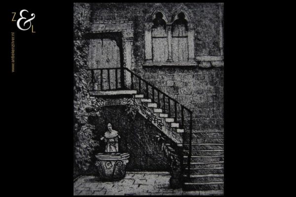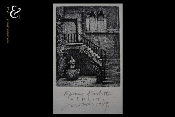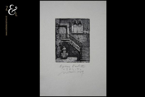 Deze ets / ex libris met de titel “Split” is gemaakt door een voor ons nog onbekende kunstenaar. Aan de onderzijde van de ets / ex libris staat in potlood Epreuve d’artiste*, “Split”, de signatuur en het jaartal 1989.