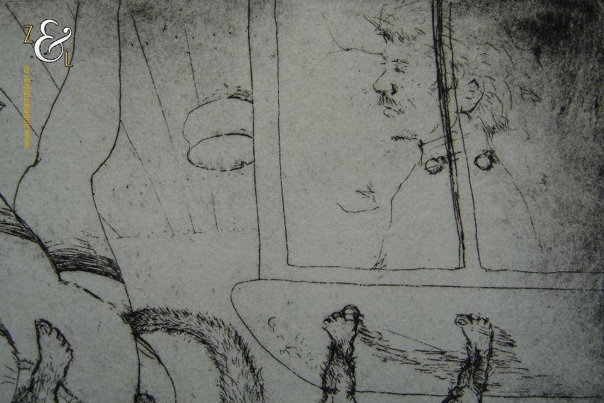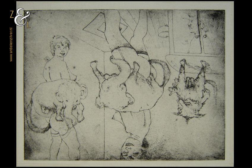 Deze ets met de afbeelding van groteske figuren / fantasiefiguren, naakte vrouwen en (zelf)portretten is gemaakt door een voor ons onbekende kunstenaar. De ets is aan de buitenzijde gemeten 36 cm lang bij 27.4 cm breed de maat van de voorstelling is 33 cm lang bij 24.5 cm breed.