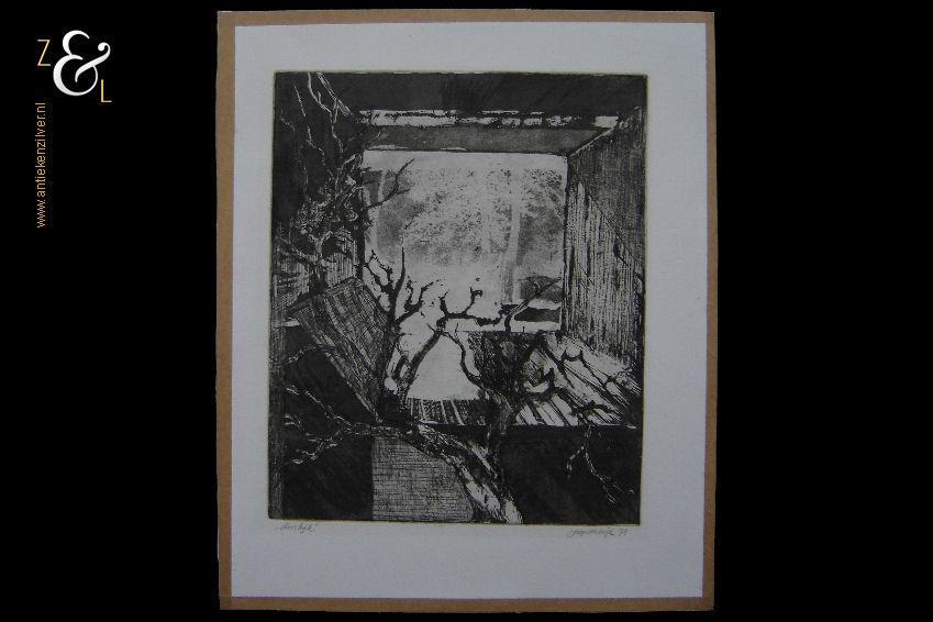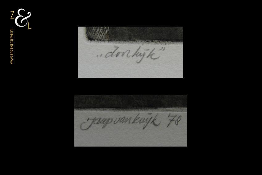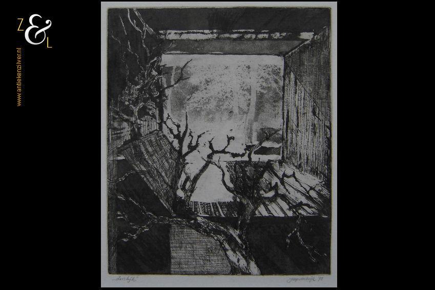 Deze ets met de titel “doorkijk” is in 1978 gemaakt door Jaap van Kuijk. De ets is rechtsonder in potlood gesigneerd en gedateerd: Jaap Van Kuijk ’78 en linksonder staat de titel: “doorkijk”. De ets is aan de buitenzijde gemeten 40 cm lang bij 33 cm breed de afbeelding van de ets is 29.5 cm lang bij 24.5 cm breed. De ets heeft een lichte foxing (een paar héél kleine vlekjes) en aan de voorzijde rondom een randje bruine tape.