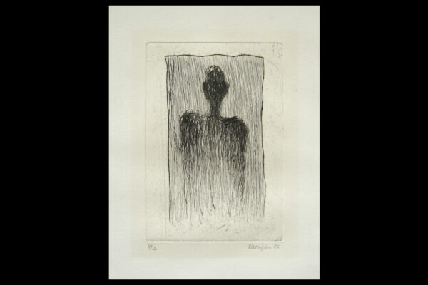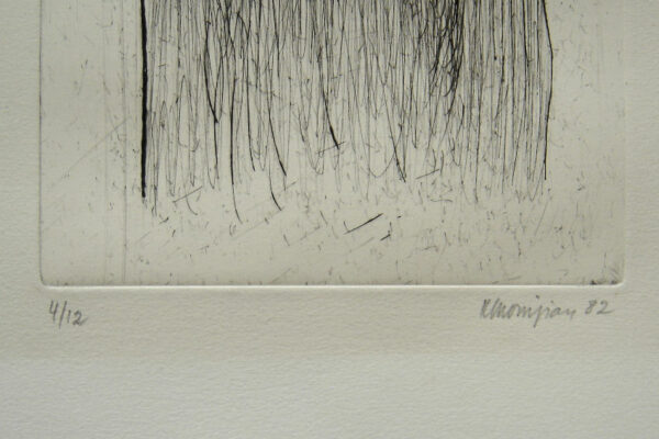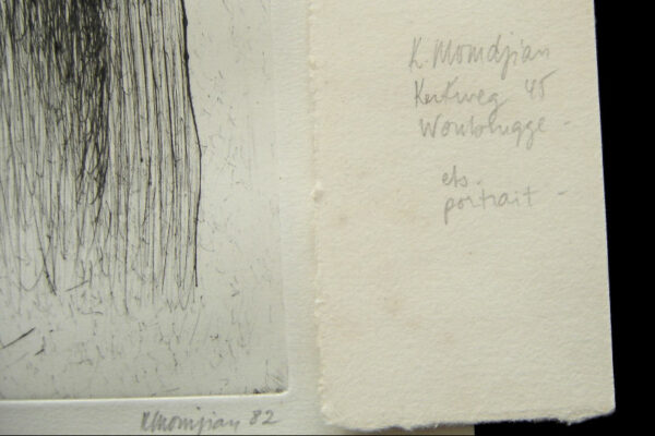 Deze ets met de titel: “Portrait” is gemaakt door Krikor Momdjian. De ets is gedrukt op zwaar etspapier en is in potlood rechtsonder gesigneerd en gedateerd K. Momdjian 82 linksonder staat de oplage 4/12. De ets is aan de buitenkant gemeten 28.2 cm lang bij 22.2 cm breed de afbeelding van de ets is 20 cm lang bij 14 cm breed. De ets heeft een héél lichte egale verkleuring en is rondom afgesneden. Op de rand van de achterkant stond het adres van K. Momdjian in Woubrugge en de titel, dit stukje (zie afbeelding) is apart uitgesneden en wordt bijgevoegd.
