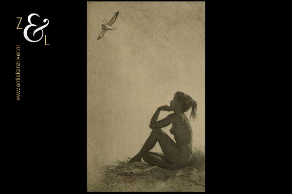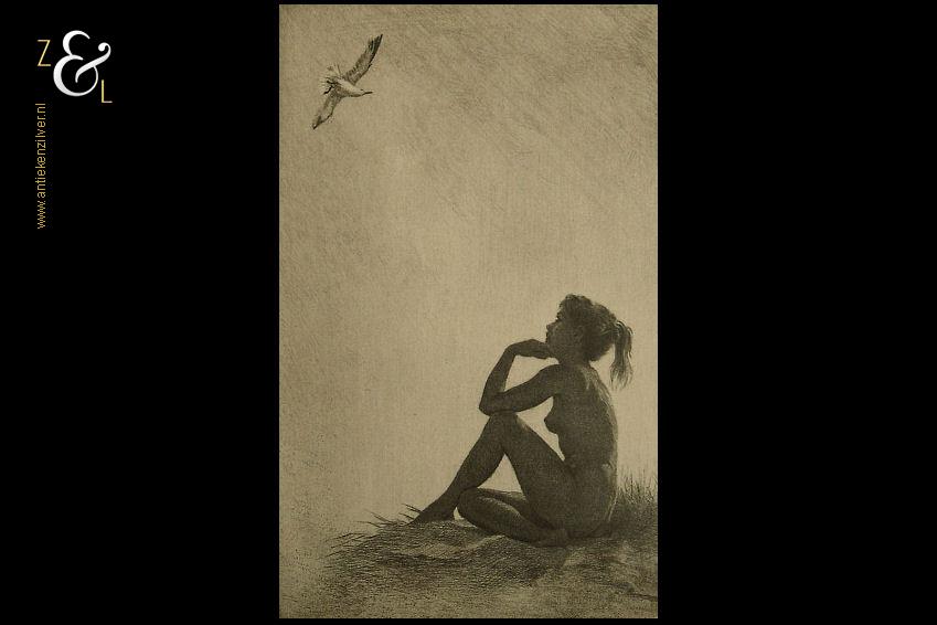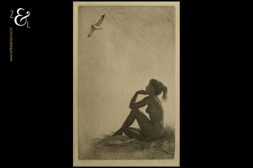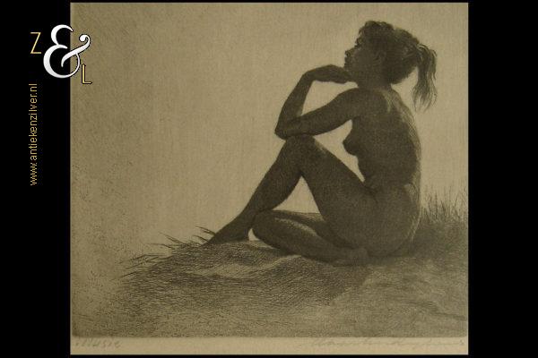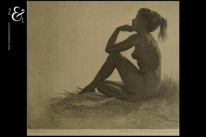 Deze ets met de titel “Illusie” is gemaakt door Maarten Langbroek. De ets die uit de veertiger / vijftiger jaren stamt is gedrukt op papier en voorzien van een lijst en passe partout gemaakt door een professionele lijstenmaker. Aan de achterzijde zit het etiket van Kunsthandel Koch Kalverstraat 158 Amsterdam. Deze kunsthandel lijstenmakerij in 1850 opgericht door Isaac en Alexander Koch was tot 2003 werkzaam. Zij hadden winkels in Amsterdam, Rotterdam, Den Haag, Haarlem, Arnhem en Leiden. De ets is rechtsonder in potlood gesigneerd Maarten Langbroek en linksonder staat de titel “Illusie”. De ets is aan de binnenzijde van het passe partout gemeten 15.3 cm lang bij 10.5 cm breed. De lijst is 27.4 cm lang bij 21.7 cm breed. De lijst heeft lichte, gebruikelijke ouderdomssporen.