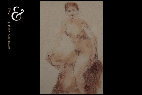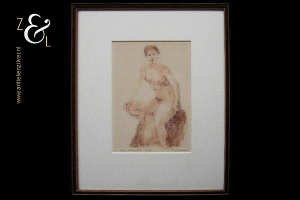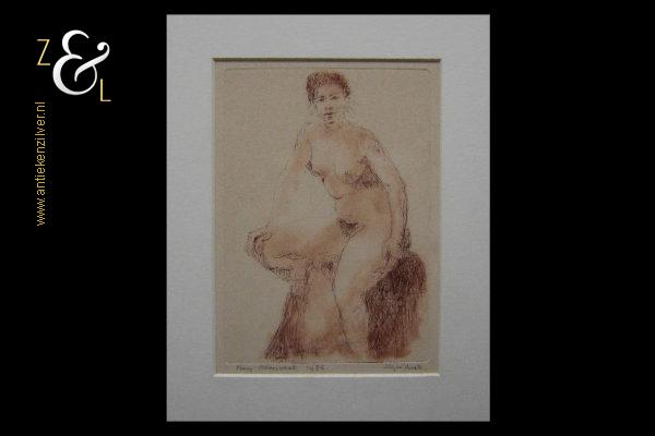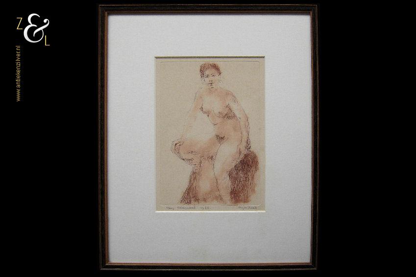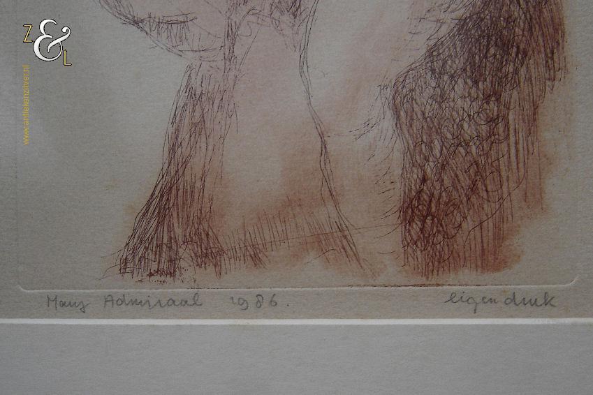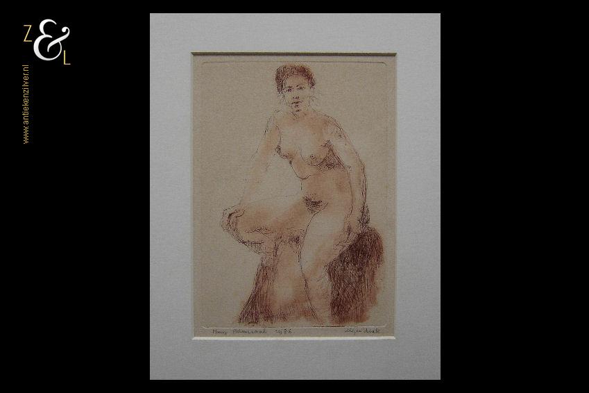 Deze ets met de afbeelding van een zittend vrouwelijk naakt is gemaakt door Mary Admiraal. De ets is gedrukt op papier en is ingelijst door een professionele lijstenmaker in een houten lijst en voorzien van een passe partout. De ets is linksonder in potlood gesigneerd en gedateerd Mary Admiraal 1986 en rechtsonder staat eigen druk. De ets is aan de binnenzijde van het passe partout gemeten 22 cm lang bij 15 cm breed. De lijst is 38.2 cm lang bij 30.4 cm breed. De lijst heeft lichte, gebruikelijke ouderdomssporen.