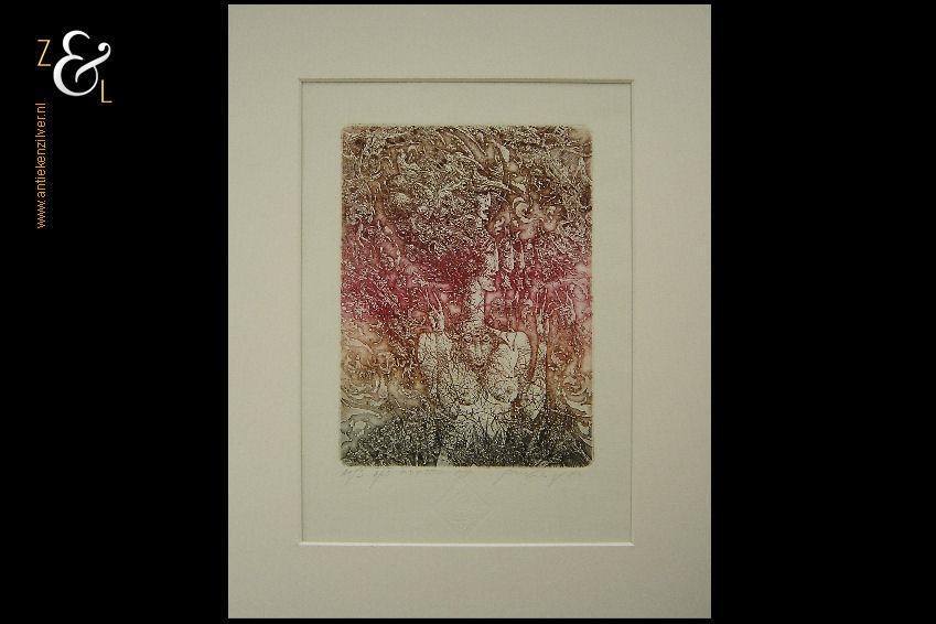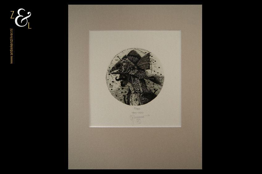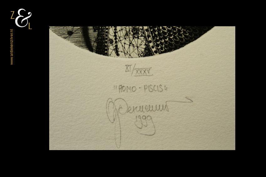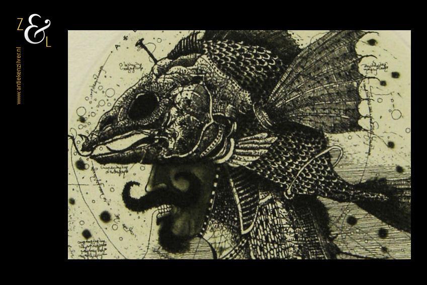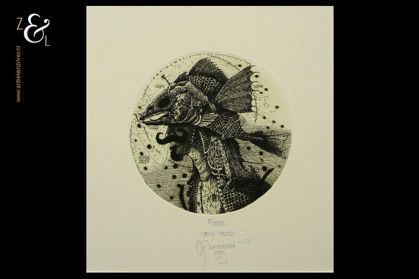Ets met de titel “Mono Piscis” gemaakt in 1999 door Oleg Denisenko in Lviv Oekraïne. De ets is genummerd in Romeinse cijfers XI/XXXV (elfde van vijfendertig stuks) en midden onder gesigneerd in potlood. De ets is niet ingelijst maar heeft wel een passe partout. De afmeting van het passe partout is: buitenzijde 24 cm bij 30 cm, binnenzijde 16 cm bij 17 cm. Het formaat van de ets heeft een diameter van 10 cm en het papier waarop de ets gedrukt staat is 20 cm bij 24 cm.