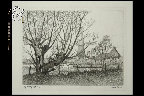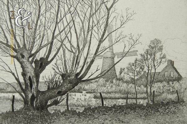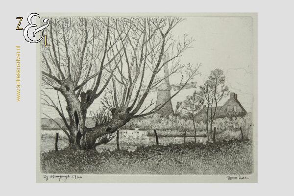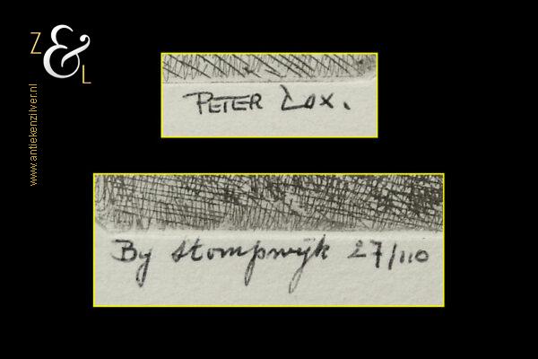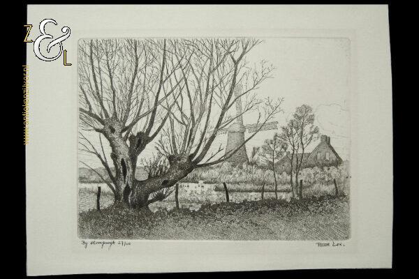 Deze ets met de titel “Bij Stompwijk” is gemaakt door Peter Cox. Op de ets zijn afgebeeld: op de voorgrond een grote knotwilg, op de achtergrond een molen met boerderij en daartussen een sloot. De ets is gedrukt op zwaar etspapier en is in potlood rechtsonder gesigneerd Peter Cox linksonder staat de titel Bij Stompwijk met daarnaast de oplage 27/110. De ets is aan de buitenzijde gemeten 30 cm lang bij 22 cm breed, de ets zelf is 22 cm lang bij 16.3 cm breed. De ets heeft een lichte egale verkleuring.