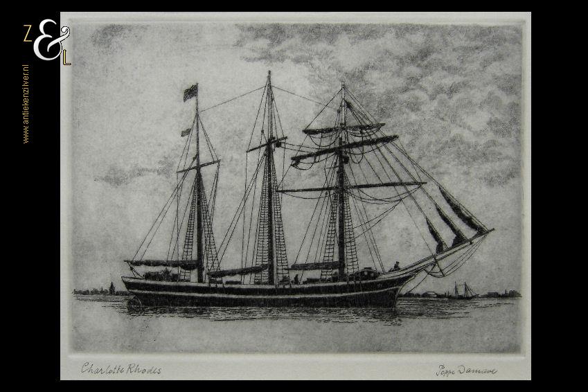 Ets met de titel “Charlotte Rhodes”* gemaakt door Poppe Harmanus Damave. De ets is rechtsonder in potlood gesigneerd: Poppe Damave en linksonder staat de titel: Charlotte Rhodes. De ets is aan de binnenzijde van het passe partout gemeten 21 cm lang bij 16 cm breed. De buitenzijde van het passe partout is 49.8 cm lang bij 34.9 cm breed.