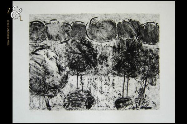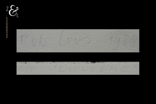 Deze ets met de titel “Dordogne” is gemaakt door Rob Loos. De ets is in potlood midden onder gesigneerd en gedateerd: Rob Loos 1988 en linksonder staat de oplage en titel: 2/15 “Dordogne”. De ets is aan de buitenzijde gemeten 75.7 lang cm bij 56.6 cm breed, de ets zelf is 59.8 cm lang bij 44.2 cm breed.