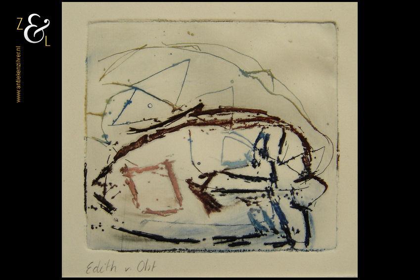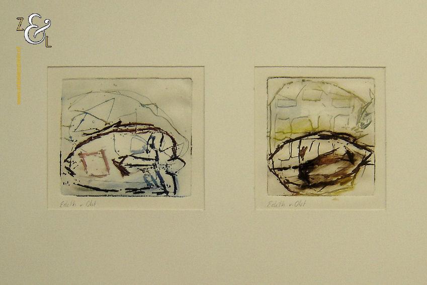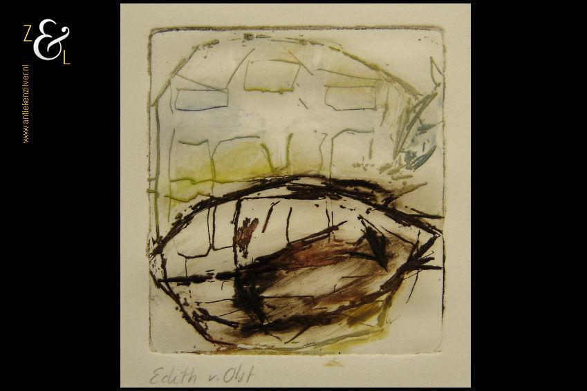 Deze twee geaquarelleerde etsen zijn gemaakt door Edith van Olst. De geaquarelleerde etsen zijn linksonder in potlood gesigneerd Edith van Olst. De geaquarelleerde etsen zijn gemeten aan de binnenzijde van het passe partout 13 cm lang bij 12 cm breed en 12 cm lang bij 10.8 cm breed. De buitenzijde van het passe partout is 50 cm lang bij 40 cm breed.
