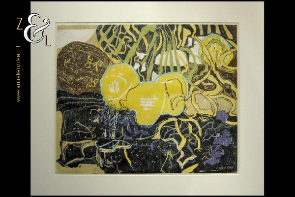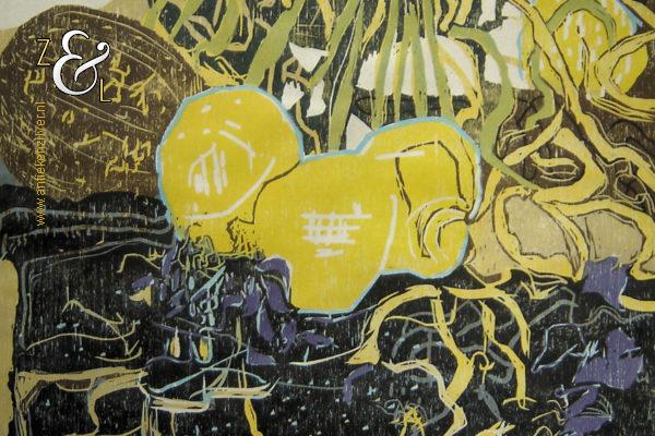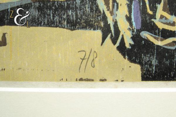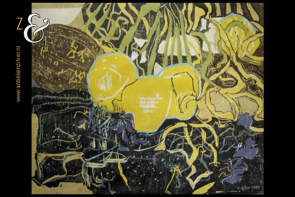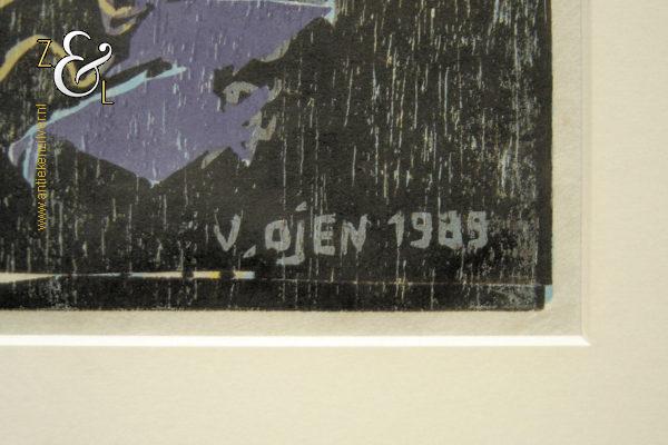 Deze houtsnede / kleurenhoutsnede met de titel “Stilleven met fruit” is gemaakt door Vincent van Ojen. De houtsnede is in de houtsnede rechtsonder gesigneerd en gedateerd v. Ojen 1989 en linksonder staat in potlood de oplage 7/8 nummer 7 van 8. De houtsnede is aan de buitenzijde van het passe partout gemeten 80 cm lang bij 65 cm breed, de houtsnede zelf meet aan de binnenzijde van het passe partout gemeten 61.7 cm lang bij 49.8 cm breed.