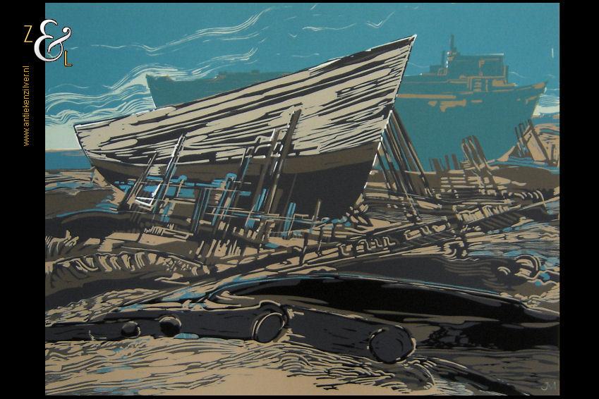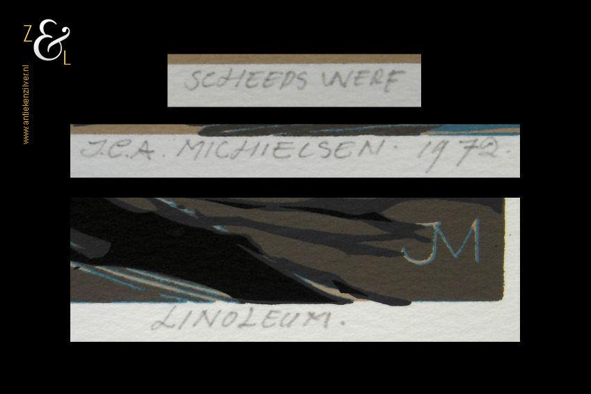 Deze linoleumsnede met de titel “Scheepswerf” is gemaakt door Jan Michielsen. De linoleumsnede is in potlood linksonder gesigneerd en gedateerd J.C.A. Michielsen 1972 midden onder staat de titel Scheepswerf en rechtsonder staat Linoleum. De linoleumsnede is tevens rechtsonder in de druk gesigneerd met de initialen van Jan Michielsen JM. De linoleumsnede is aan de buitenzijde gemeten 72.6 cm lang bij 55.7 cm breed de linoleumsnede zelf is 51.5 cm lang bij 39.8 cm breed. De linoleumsnede heeft wat kreukjes maar niet in de afbeelding.