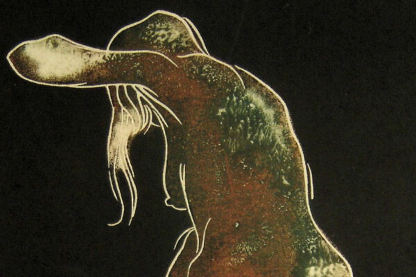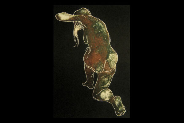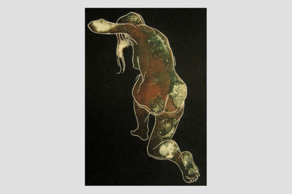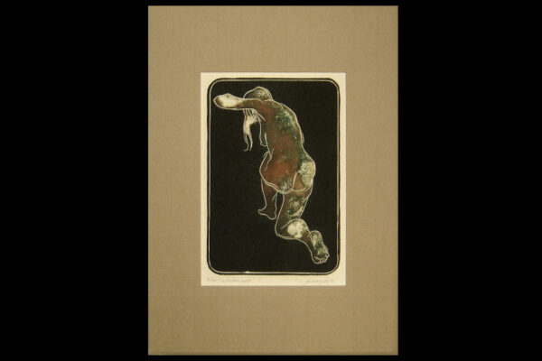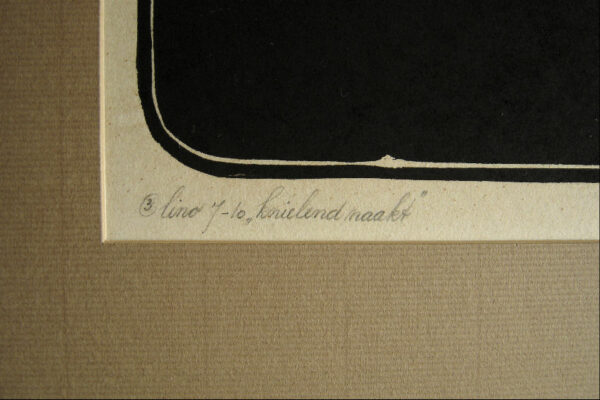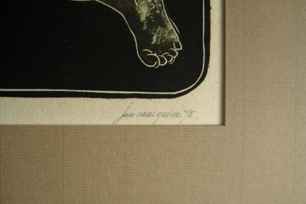 Deze linoleumsnede is gemaakt door Jan van Geem in Spaarndam (Gem. Haarlem). De linoleumsnede is rechtsonder in potlood gesigneerd en gedateerd Jan van Geem ’75 linksonder staat de druktechniek: lino, de oplage: 7-10 en de titel “knielend naakt”. De afmeting van de linoleumsnede is aan de binnenzijde van het passe partout gemeten 33 cm lang bij 22.5 cm breed. De buitenzijde van het passe partout is 55 cm lang bij 39.6 cm breed. De linoleumsnede heeft een lichte foxing (kleine vlekjes) buiten de afbeelding.