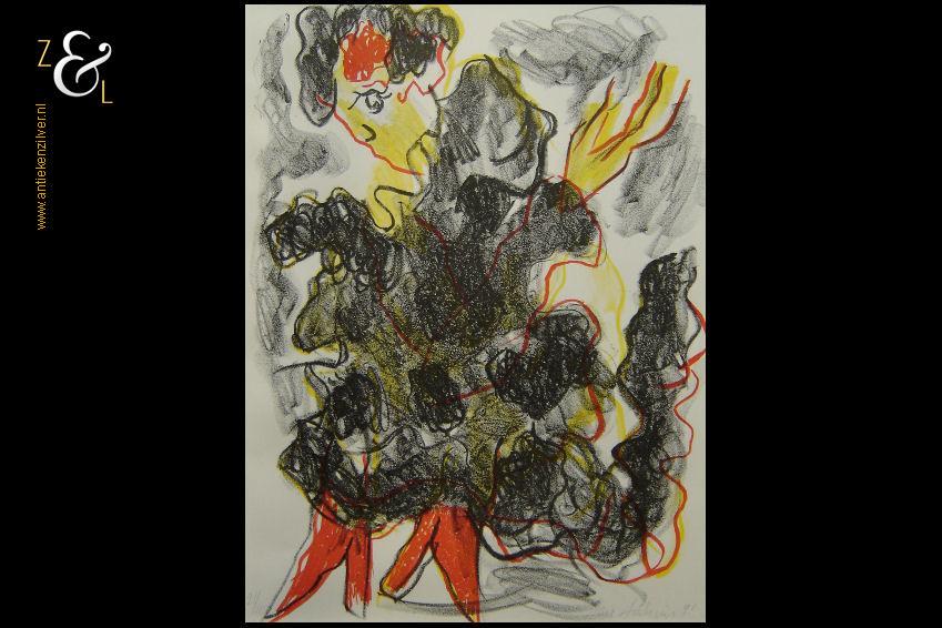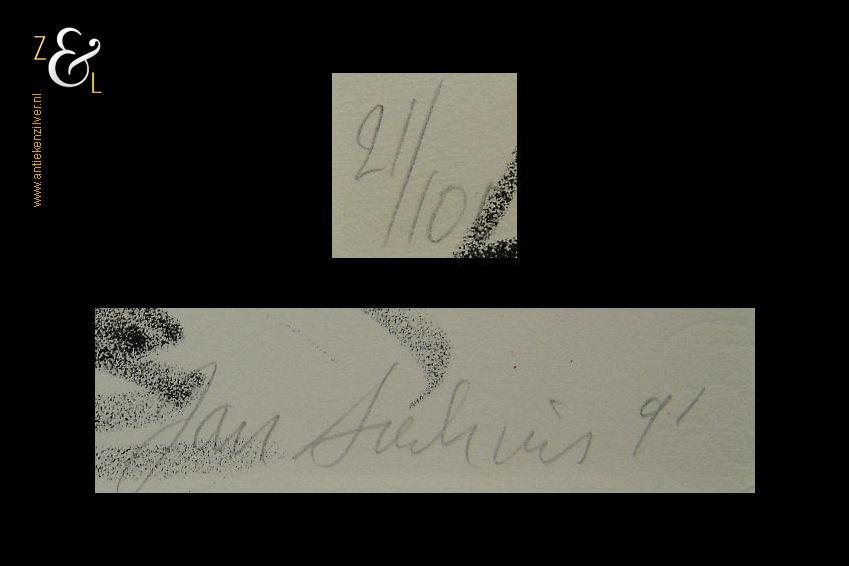 Deze litho met de titel “Flamenco” is gemaakt door Jan Sierhuis. De litho is in potlood rechtsonder gesigneerd en gedateerd Jan Sierhuis ’91 en linksonder staat de oplage 21/100. De binnenzijde van het passe partout is 64 cm lang bij 48.5 cm breed, de buitenzijde van het passe partout is 79.5 cm lang bij 63 cm breed.