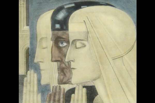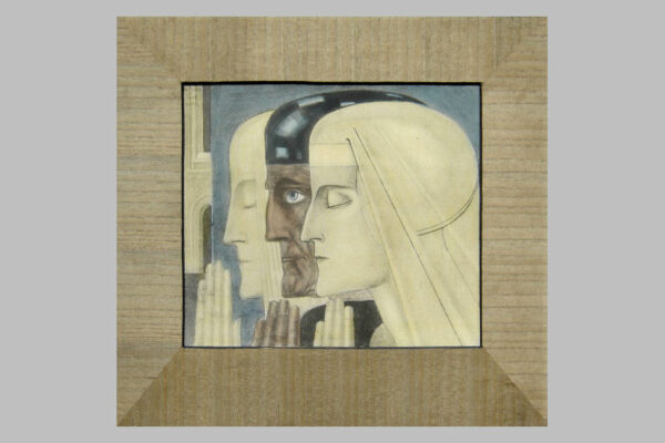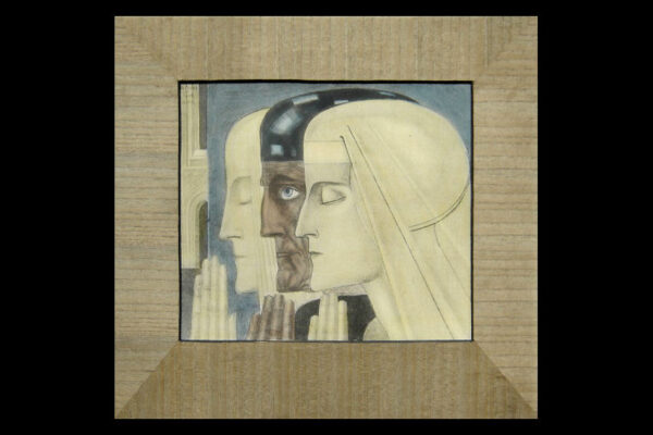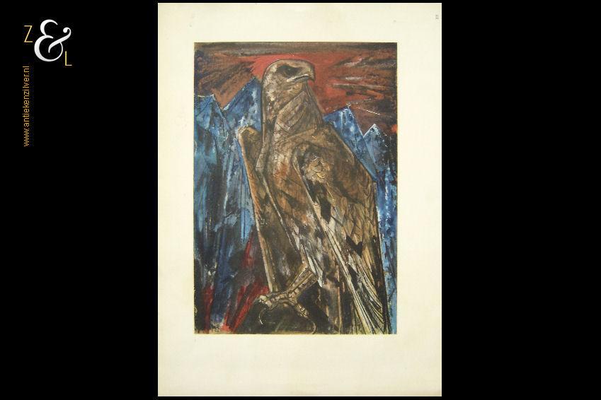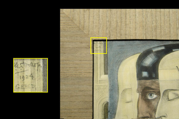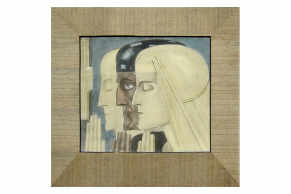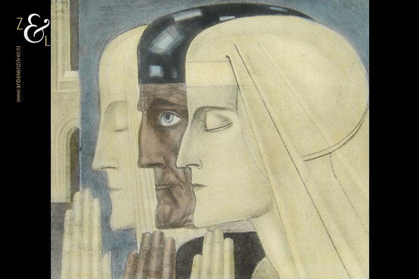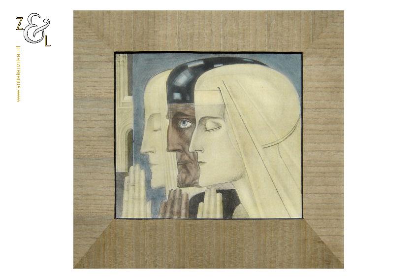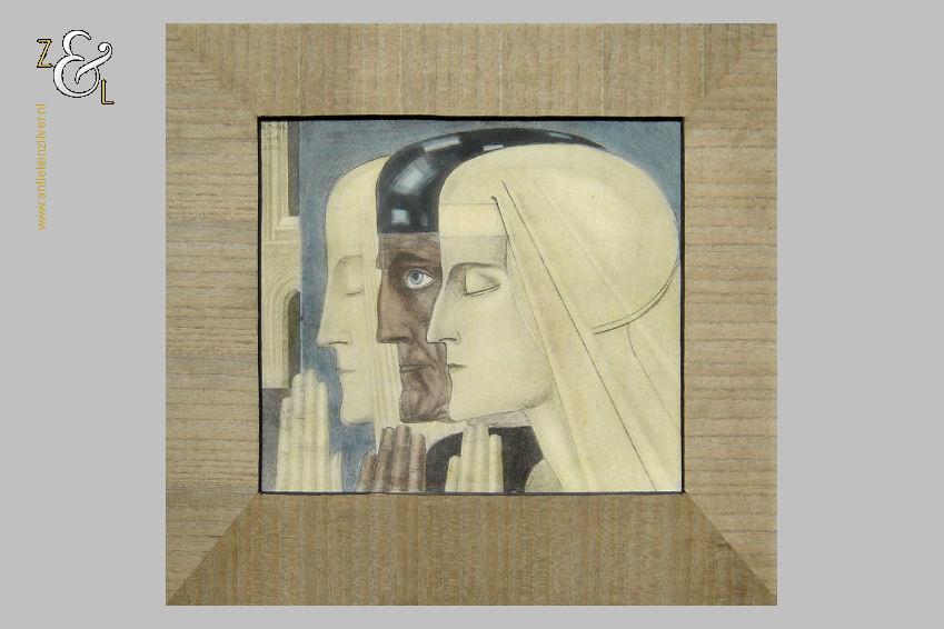 Deze reproductie / litho met de titel “Gebed” is gemaakt door Jan Toorop. De mystiek- religieus ingekleurde reproductie heeft het nog originele met hout gefineerde passe partout en is linksboven in de druk gesigneerd en gedateerd: J. Toorop met daaronder het jaar 1924 en daaronder de titel: Gebed. De reproductie is aan de binnenzijde van het passe partout gemeten 26 cm lang bij 22 cm breed. De buitenzijde van het passe partout is 38.5 cm lang bij 35.5 cm breed. Van de reproductie is de oude beschadigde lijst verwijderd en in het blauw is een klein vlekje geretoucheerd (zie geel omkaderd gedeelte op afbeelding).