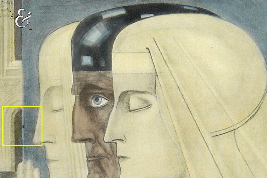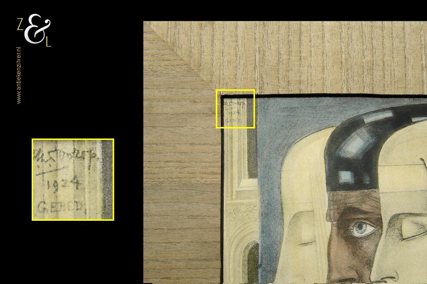Deze reproductie / litho met de titel “Gebed” is gemaakt door Jan Toorop. De mystiek- religieus ingekleurde reproductie heeft het nog originele met hout gefineerde passe partout en is linksboven in de druk gesigneerd en gedateerd: J. Toorop met daaronder het jaar 1924 en daaronder de titel: Gebed. De reproductie is aan de binnenzijde van het passe partout gemeten 26 cm lang bij 22 cm breed. De buitenzijde van het passe partout is 38.5 cm lang bij 35.5 cm breed. Van de reproductie is de oude beschadigde lijst verwijderd en in het blauw is een klein vlekje geretoucheerd (zie geel omkaderd gedeelte op afbeelding).