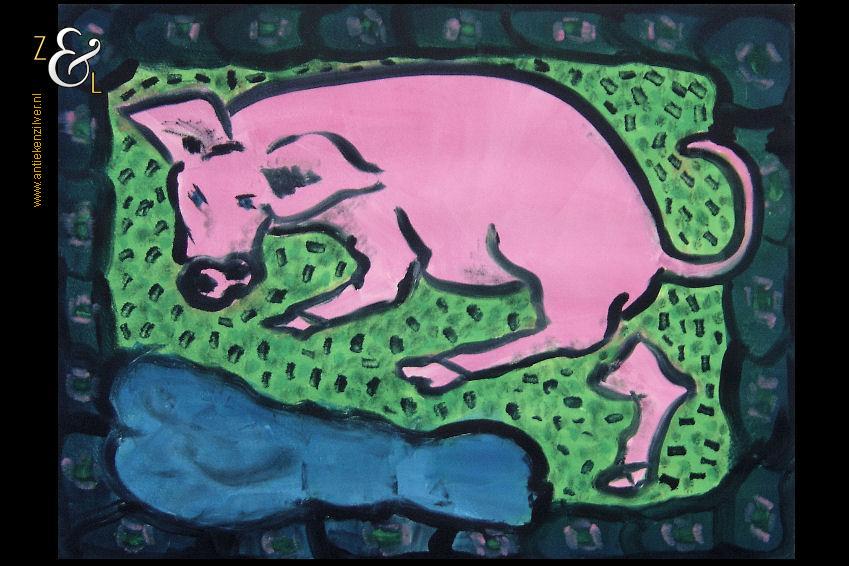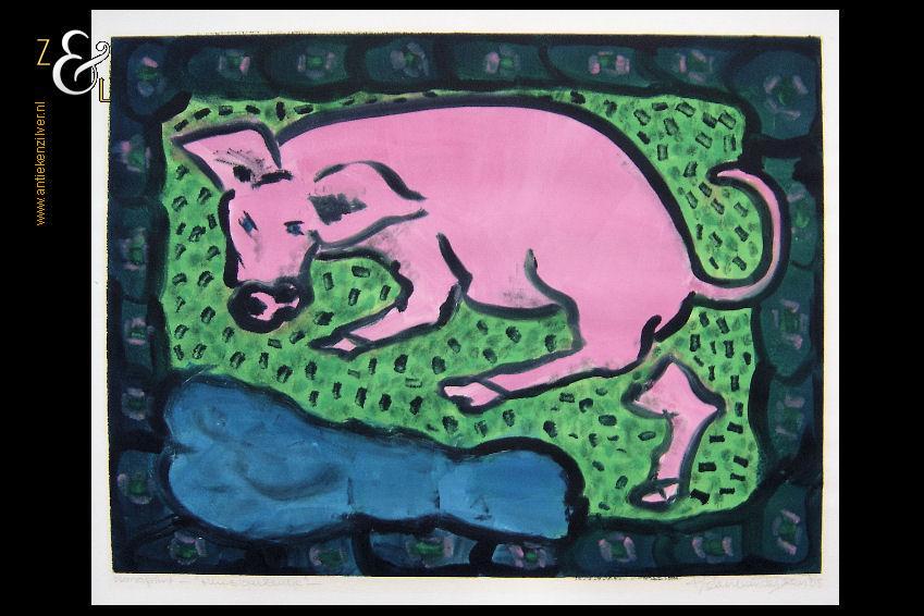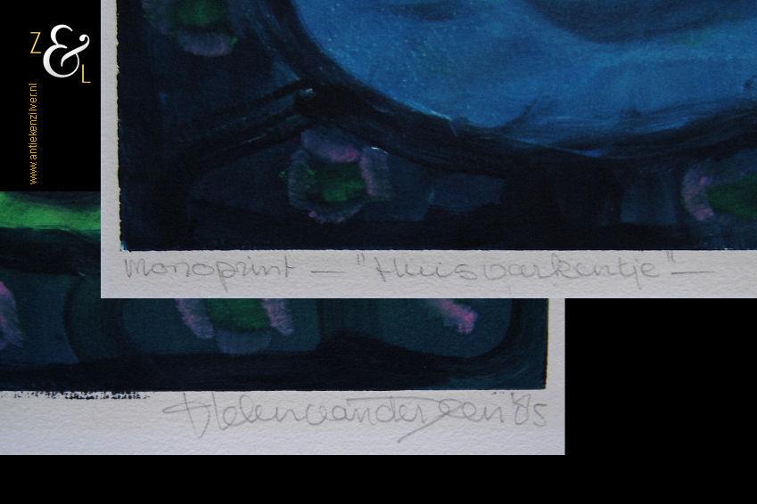 Deze monoprint is in 1985 gemaakt door Helen van der Deen (werkzaam te Amsterdam). De monoprint is met potlood rechtsonder gesigneerd en gedateerd met Helen van der Deen ’85 en linksonder staat Monoprint en de titel “Huisvarkentje”. De afmeting van deze monoprint is 64.5 cm bij 50 cm.