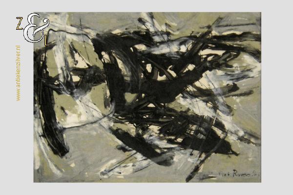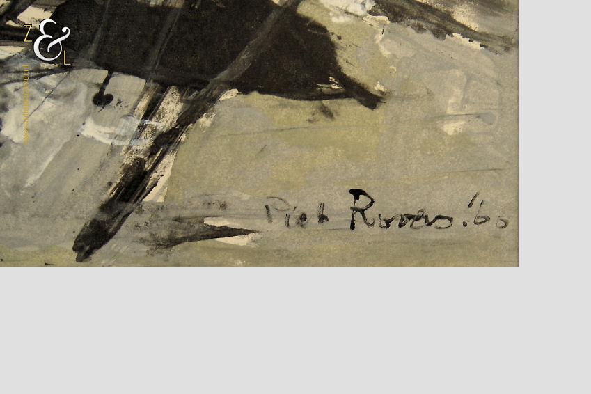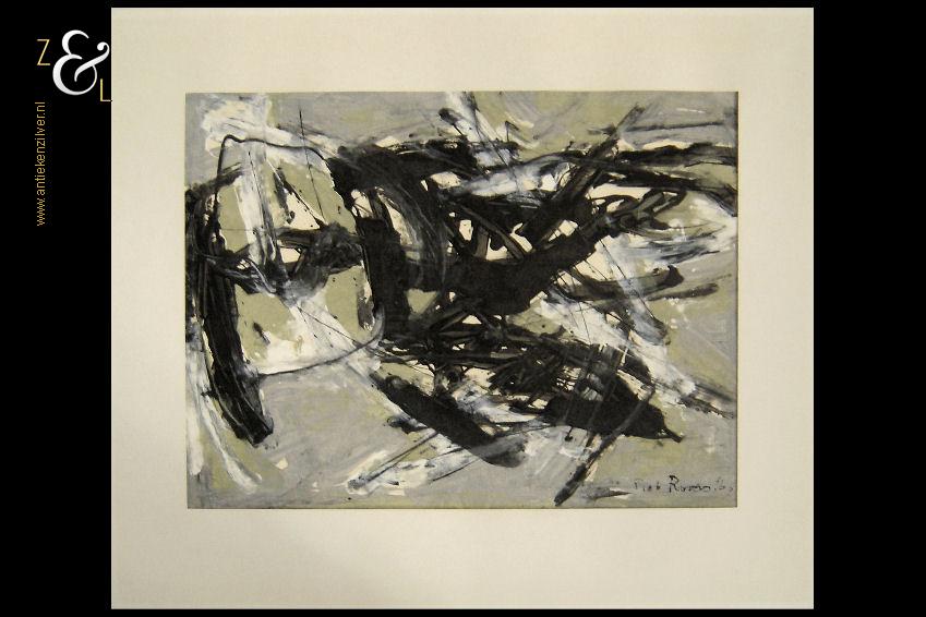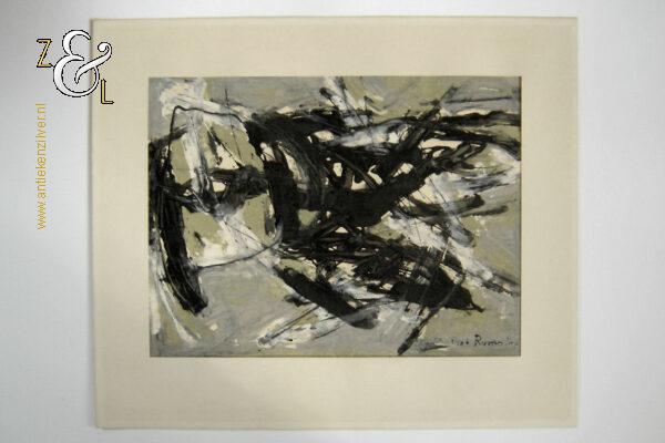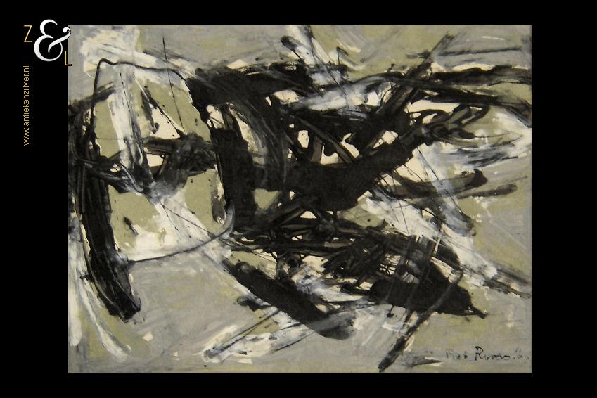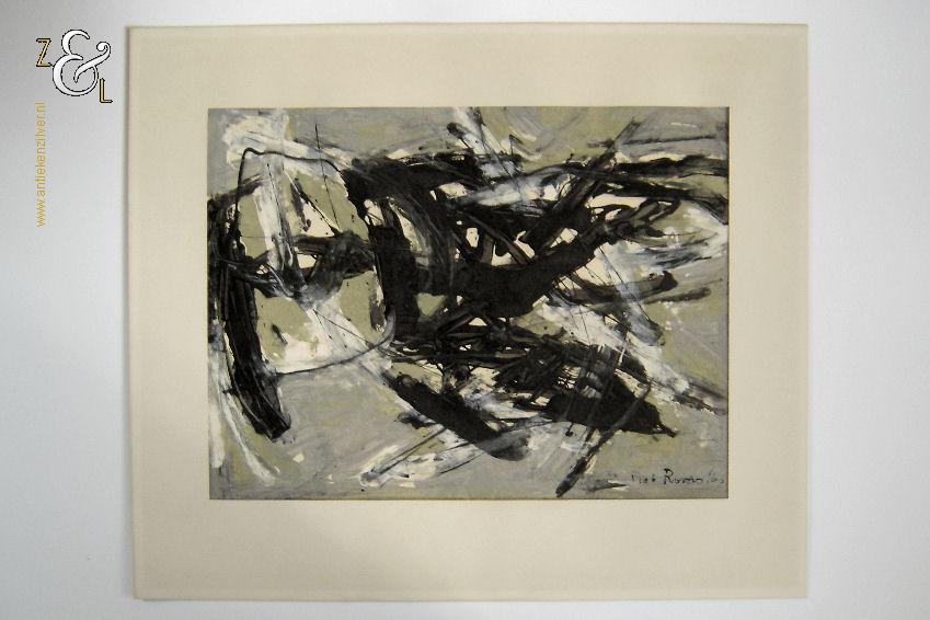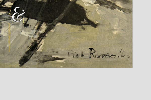 Deze monoprint / monotype / monotypie is gemaakt door de Rotterdamse kunstenaar Piet Roovers. Het kunstwerk dat in de abstracte stijl is vervaardigd is rechtsonder in zwarte verf gesigneerd en gedateerd Piet Roovers ’60. De monoprint / monotype / monotypie is aan de binnenzijde van het passe partout gemeten 52 cm lang bij 38 cm breed, de buitenzijde van het passe partout is 67.8 cm lang bij 56 cm breed. Op de achterzijde van de monoprint / monotype / monotypie zit een etiket van de Gemeente Rotterdam – Afdeling kunstzaken met de naam van de kunstenaar P. Roovers en de aankoopdatum 9 januari 1961.