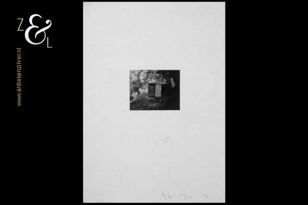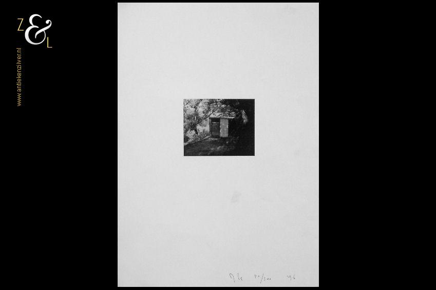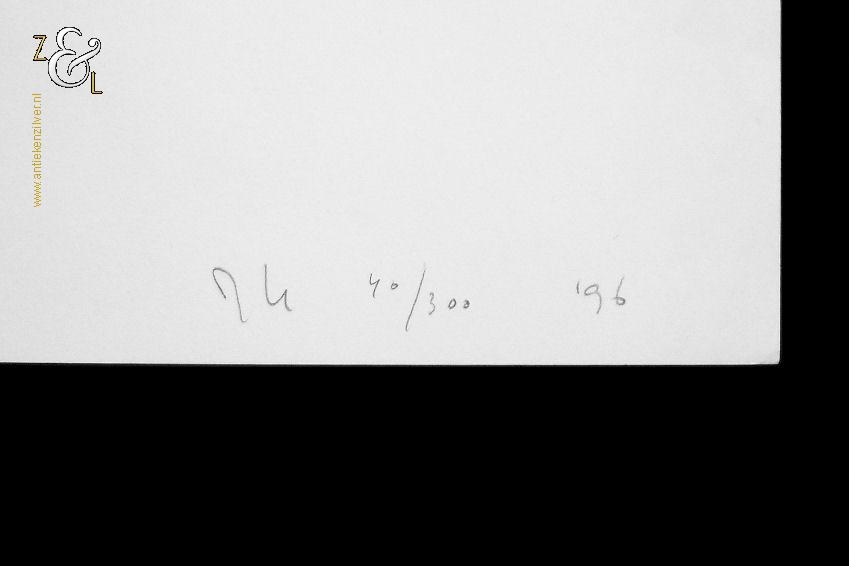 Deze print zonder titel is gemaakt door Johan Kuipers. De print is gedrukt op wit 120 grams papier met rechtsonder in potlood de signatuur van Johan Kuipers JK daarnaast de oplage 40/300 nummer 40 van 300 en het jaar ’96. De print heeft de afmeting van een A4, 29.7 cm lang bij 21 cm breed. De print heeft kreukjes en aan de achterzijde is het papier beschadigd door het gebruik van dubbelzijdig tape.