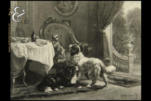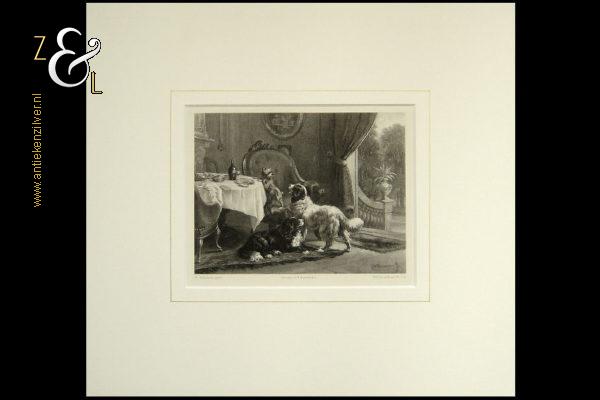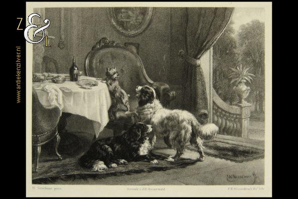 Deze steendruk is gedrukt in Dordrecht door graveur J.D. Steuerwald. De steendruk met de afbeelding “Honden in een interieur” is van kunstenaar F.H. Weissenbruch naar een schilderij van W. Verschuur. De steendruk is gedrukt op papier en voorzien van een passe partout gemaakt door een professionele lijstenmaker. De steendruk is gesigneerd met linksonder: W. Verschuur, midden onder: J.D. Steuerwald en rechtsonder: F.H. Weissenbruch. De steendruk is tevens rechtsonder in de druk gesigneerd met W. Verschuur. De steendruk is aan de binnenzijde van het passe partout gemeten 20.5 cm lang bij 16.2 cm breed, de buitenzijde van het passe partout is 40 cm lang bij 37 cm breed. De steendruk draagt op de achterzijde het etiket van Kunsthandel Lijstenmakerij Finestrino Del Arte.