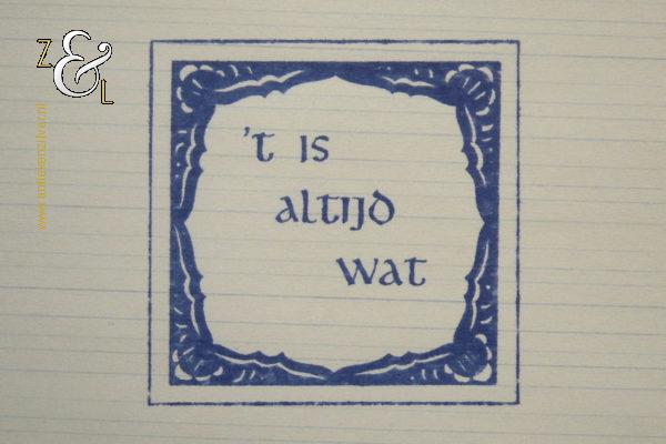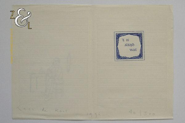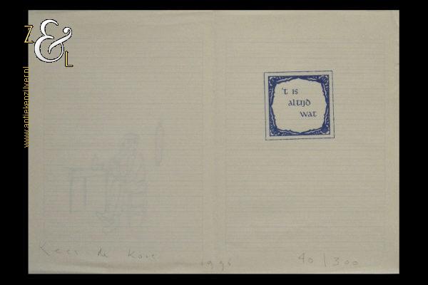 Dit kunstwerk, stempels op papier uit een schoolschrift met de titel “’t is altijd wat” is gemaakt door Kees de Kort. Het kunstwerk is aan twee kanten gestempeld, aan één kant met blauwe inkt de afbeelding van een tegel met het opschrift ’t is altijd wat, deze kant is tevens aan de onderzijde in potlood gesigneerd, met links Kees de Kort, in het midden het jaartal 1996 en rechts de oplage 40/300 nummer 40 van 300. Aan de andere kant met bruine inkt de afbeelding van een figuur zittend aan een tafel. Het kunstwerk is 29.5 cm lang bij 20.8 cm breed en heeft kreukjes.