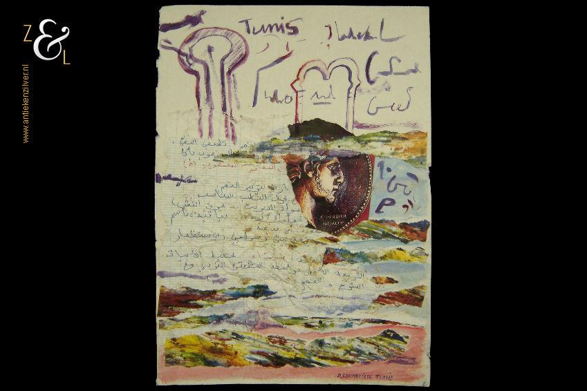 Deze collage met de titel “Tunis” is gemaakt door Ruud Cornelisse. De collage is in pen rechtsonder gesigneerd R. Cornelisse met daarachter de titel Tunis. De collage is 29.5 cm lang bij 20.7 cm breed.