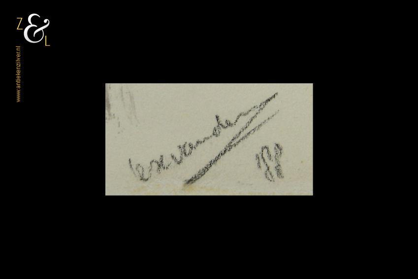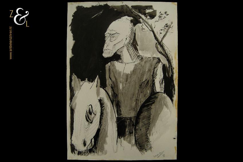 Deze gewassen inkttekening met de afbeelding van een ruiter op paard is gemaakt door een voor ons nog onbekende kunstenaar. De gewassen inkttekening die de sfeer weergeeft van een Japanse prent is rechtsonder in potlood gesigneerd en gedateerd: Lex van de… ’88. De gewassen inkttekening heeft aan de randen lijmresten van een door ons verwijderd niet zuurvrij passe partout. De gewassen inkttekening is 31 cm lang bij 21.6 cm breed.