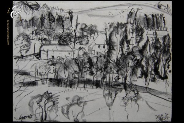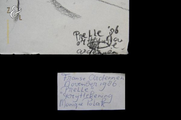 Deze krijttekening is gemaakt door Monique Polak en meet 55.8 cm bij 41.2 cm. De krijttekening is rechtsonder in krijt gesigneerd en gedateerd met haar initialen MP en Prelle Ardennen nov ’86. Tevens zat er bij de krijttekening een etiket met het opschrift: Franse Ardennen november 1986 “Prelle” Krijttekening Monique Polak. Zie ook de aquarellen van Monique Polak aangeboden op onze website.