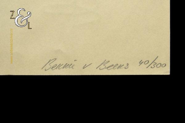 Deze zeefdruk zonder titel is gemaakt door Berrie van Beers. De zeefdruk is met rode en blauwe inkt gedrukt op beige / bruin 80 grams papier en is op de achterzijde rechtsonder in potlood gesigneerd Berrie v Beers met daarnaast de oplage 40/300 nummer 40 van 300. De zeefdruk heeft de afmeting van een A4, 29.7 cm lang bij 21 cm breed.
