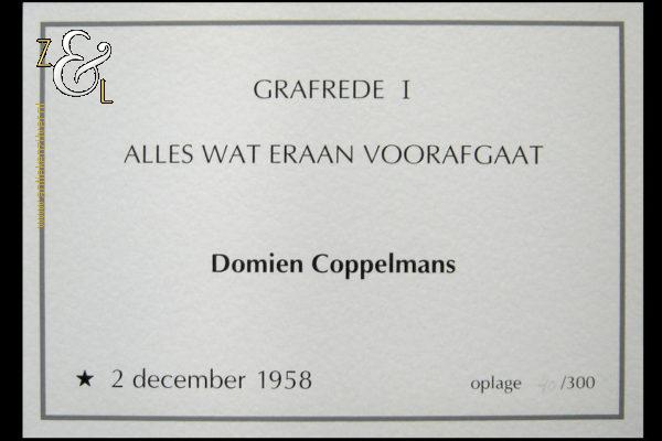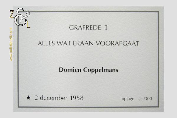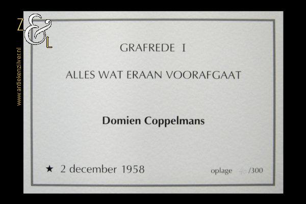 Deze zeefdruk met de titel “Grafrede I” is gemaakt door Domien Coppelmans. De zeefdruk is met zwarte inkt gedrukt op wit 240 grams structuurpapier. Op de zeefdruk staat rechtsonder de oplage 40/300 nummer 40 van 300. De zeefdruk heeft de afmeting van een A4, 29.7 cm lang bij 21 cm breed.