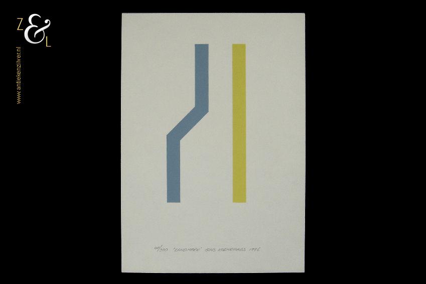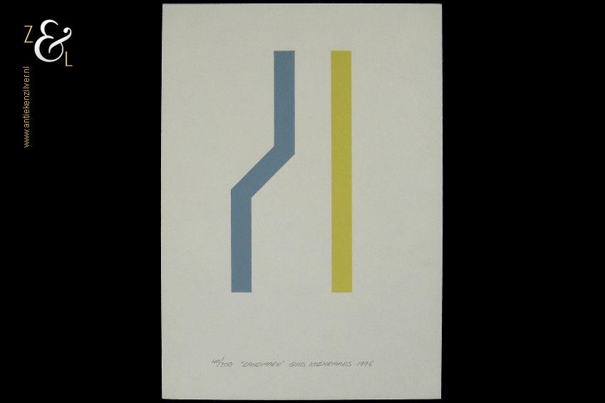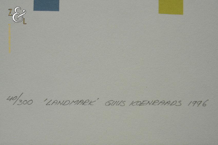 Deze zeefdruk met de titel “Landmark” is gemaakt door Guus Koenraads. De zeefdruk is met de kleuren blauw en geel gedrukt op gebroken wit 240 grams papier. Op de zeefdruk staat aan de onderzijde in potlood de oplage 40/300 nummer 40 van 300 de titel “Landmark” de signatuur van Guus Koenraads en het jaartal 1996. De zeefdruk heeft de afmeting van een A4, 29.7 cm lang bij 21 cm breed.