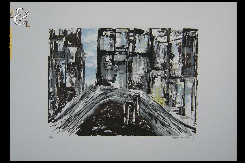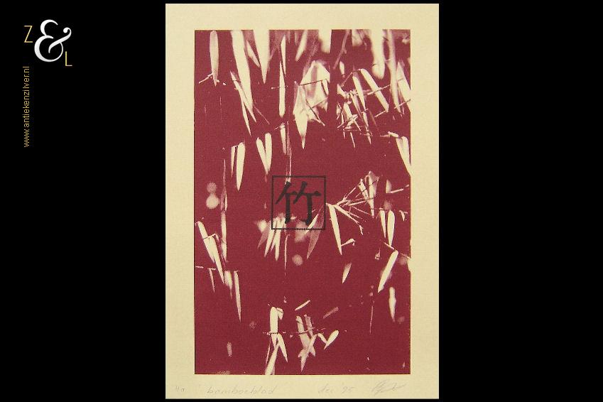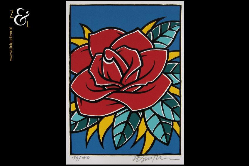 Deze zeefdruk met de titel “Rose Red” is gemaakt door Henk Schiffmacher. De zeefdruk is rechtsonder in potlood gesigneerd H. Schiffmacher en linksonder staat de oplage 139/180. De zeefdruk is aan de buitenzijde gemeten 73.9 cm lang bij 54.8 cm breed en de druk zelf is 54 cm lang bij 40 cm breed. De zeefdruk heeft een vlek in de linkerbovenhoek.
