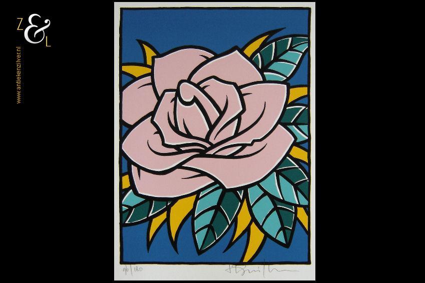 Deze zeefdruk met de titel “Rose Pink” is gemaakt door Henk Schiffmacher. De zeefdruk is rechtsonder in potlood gesigneerd H. Schiffmacher en linksonder staat de oplage 96/180. De zeefdruk is aan de buitenzijde gemeten 73.9 cm lang bij 54.8 cm breed en de druk zelf is 54 cm lang bij 40 cm breed.