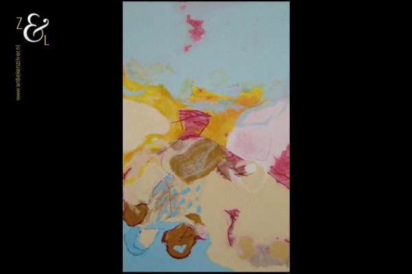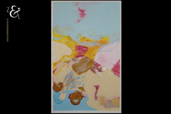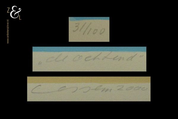 Deze zeefdruk met de titel “De ochtend” is gemaakt door Henk van Vessem. De zeefdruk is in potlood rechtsonder gesigneerd en gedateerd Vessem 2000 midden onder staat de titel “De ochtend” en linksonder staat de oplage 31/100. De zeefdruk is gemeten aan de binnenzijde van het passe partout 73 cm lang bij 44 cm breed. De buitenzijde van het passe partout is 90 cm lang bij 60 cm breed. Henk van Vessem “Ik werk vanuit mijn gevoel, mijn buik en zoek naar mogelijkheden om wisselende stemmingen en gevoelens uit te drukken”.