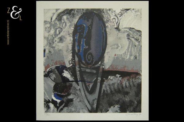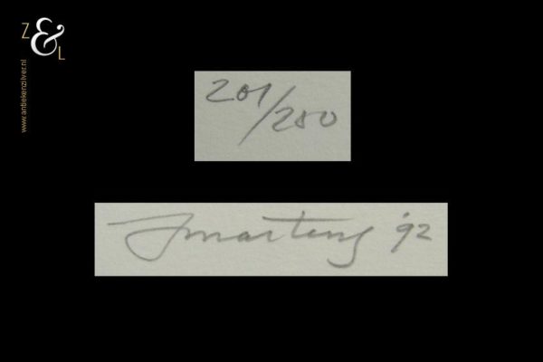 Deze zeefdruk van Jan Martens is gemaakt in 1992 en meet 52 cm bij 50 cm. De zeefdruk is in potlood rechtsonder gesigneerd en gedateerd met J. Martens ’92, linksonder staat de oplage 201 / 250.