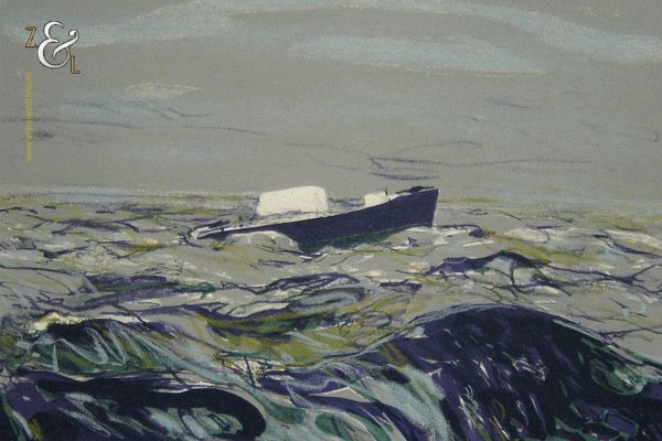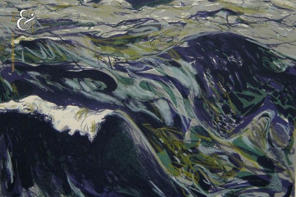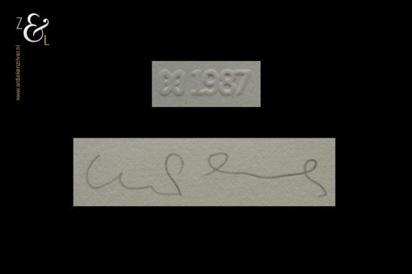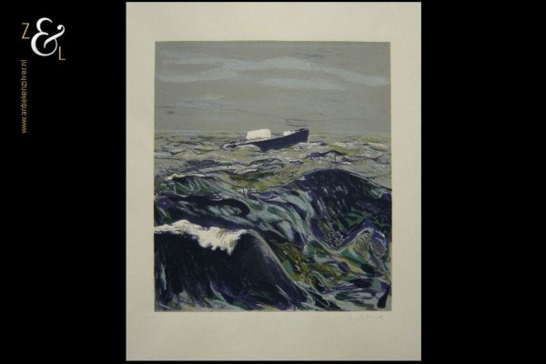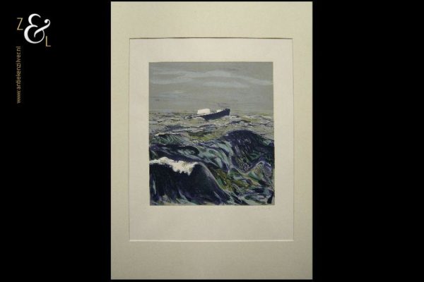 Deze zeefdruk met de titel “’s Zondags: de zee” is gemaakt door Marian Plug. De zeefdruk heeft rechtsonder in potlood de signatuur van Marian Plug en linksonder heeft de zeefdruk een blinddruk met het logo van Ahold en 1987. De zeefdruk is gemeten aan de binnenzijde van het passe partout 49 cm lang bij 39 cm breed. De buitenzijde van het passe partout is 64.8 cm lang bij 50 cm breed. De afbeelding is 34.7 cm lang bij 29.5 cm breed. De passe partout heeft aan de bovenkant een beschadiging (deukje).
