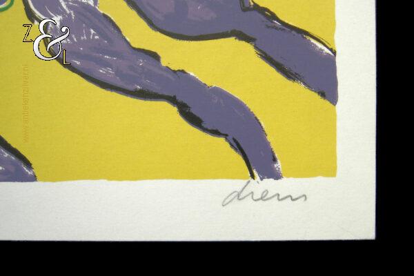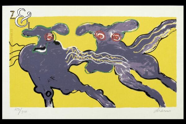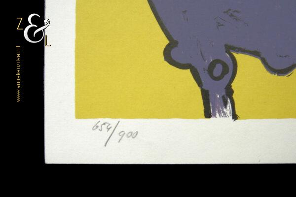 Deze zeefdruk met de titel “Flying Cows Yellow” is gemaakt door Peter Diem. De zeefdruk is met de kleuren geel, paars, rood en zwart gedrukt op karton / zwaar papier. Op de zeefdruk staat in potlood linksonder de oplage 654/900 en rechtsonder de signatuur van Peter Diem “Diem”. De zeefdruk is aan de buitenzijde gemeten 39.5 cm lang bij 24.8 cm breed.