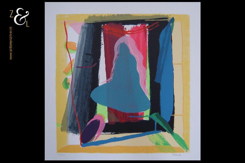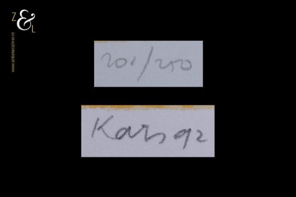 Deze zeefdruk van Rob Kars is gemaakt in 1992 en meet 55 cm bij 55 cm. De zeefdruk is in potlood rechtsonder gesigneerd en gedateerd met Kars ’92, linksonder staat de oplage 201 / 250.