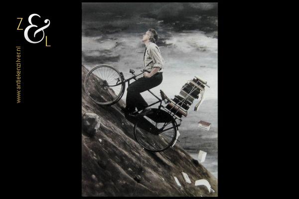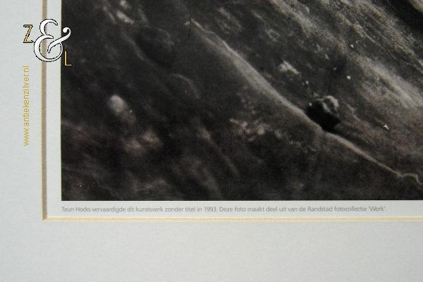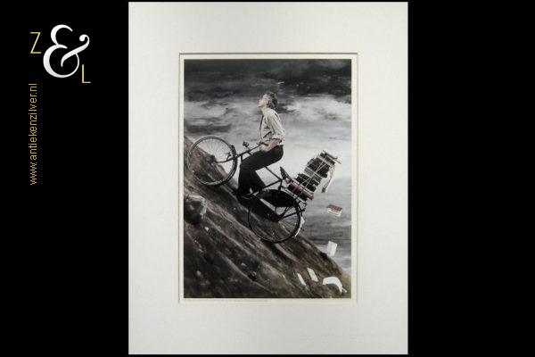 Deze print / foto zonder titel met de afbeelding van een man op een fiets (man on a bicycle) is gemaakt door Teun Hocks. De print / foto is een uitgave van Randstad Uitzendbureau uit 1996 van een foto van Teun Hocks uit 1993. Links onder de foto staat de gedrukte tekst: Teun Hocks vervaardigde dit kunstwerk zonder titel in 1993. Deze foto maakt deel uit van de Randstad foto collectie “Werk”. Tevens heeft het passe partout rechtsonder in blinddruk het logo van Randstad, met daarachter Randstad Uitzendbureau. De print / foto is aan de binnenzijde van het passe partout gemeten 34.8 cm lang bij 24.8 cm breed, de buitenzijde van het passe partout is 50 cm lang bij 40 cm breed.