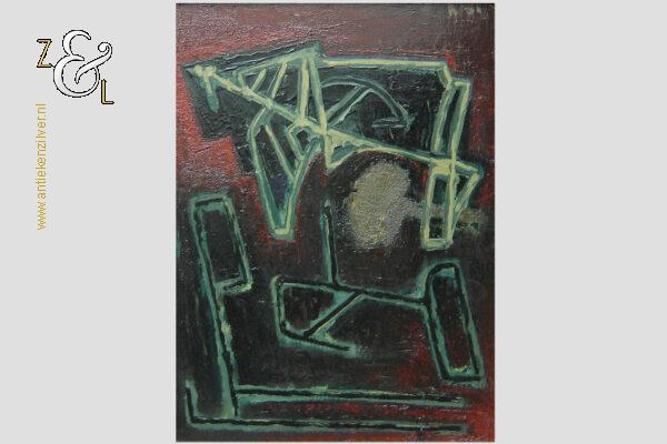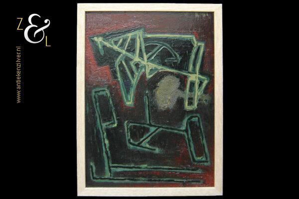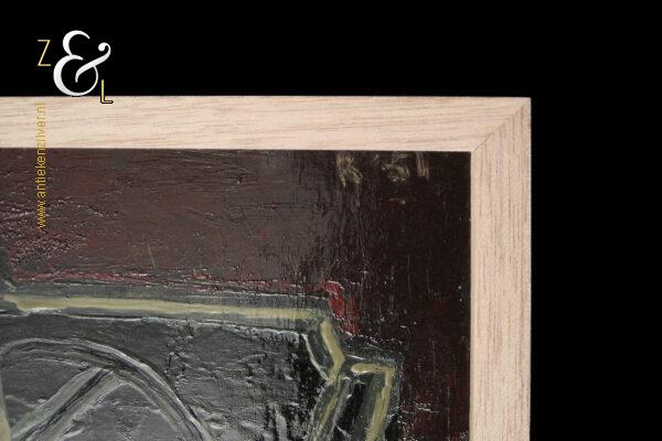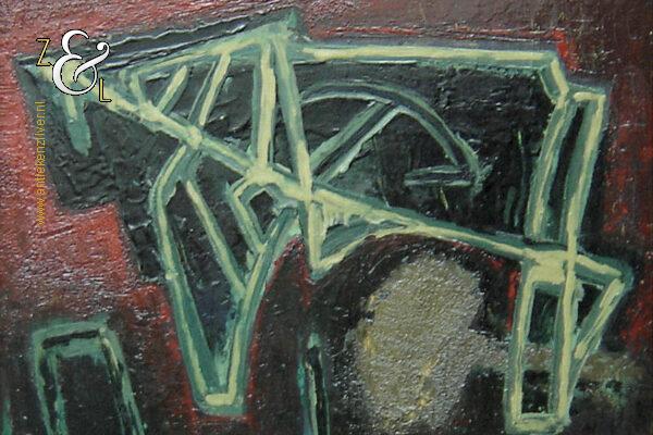 Dit schilderij is gemaakt door de Rotterdamse kunstenaar Piet Roovers. Het kunstwerk dat in de abstract figuratieve stijl is geschilderd heeft rechtsboven de signatuur van Piet Roovers en is in verf gesigneerd en gedateerd R ’51. Door gebruik van (waarschijnlijk) zand in de verf hebben sommige plekken op het schilderij een grove structuur, waardoor het kunstwerk meer diepte en levendiger is geworden. Het schilderij is aan de buitenkant van de lijst gemeten 45.8 cm lang bij 35.2 cm breed en is aan de binnenkant van de lijst gemeten 42.1 cm lang bij 31.3 cm breed.