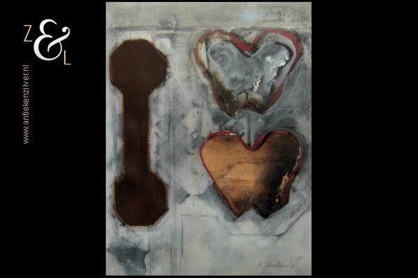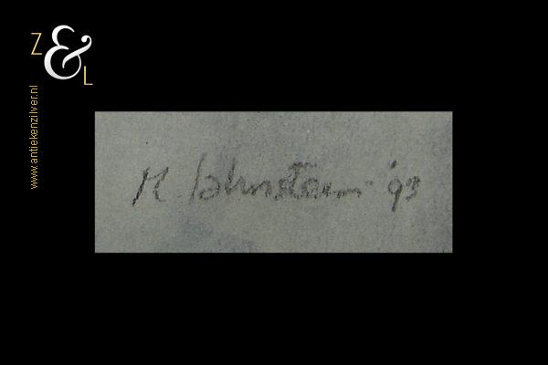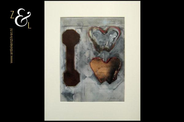 Deze collage / gemengde techniek met de titel “Piëdestal” is gemaakt door Marjan Lahnstein. De collage / gemengde techniek is rechtsonder in potlood gesigneerd en gedateerd M. Lahnstein ’93. De binnenzijde van het passe partout is 34.5 cm lang bij 26.2 cm breed, de buitenzijde van het passe partout is 50 cm lang bij 40 cm breed.