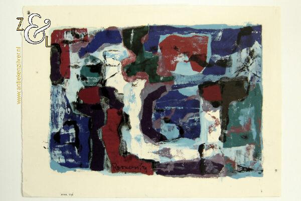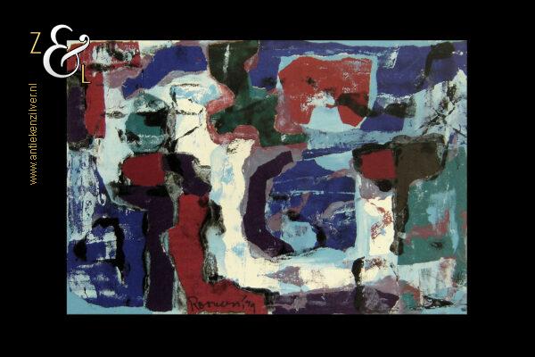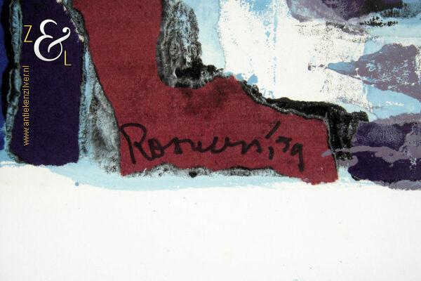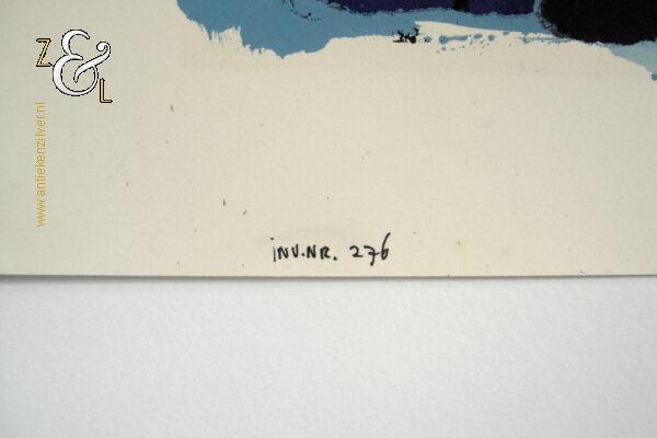 Deze collage is gemaakt door de Rotterdamse kunstenaar Piet Roovers. Het kunstwerk dat in de abstracte stijl is vervaardigd is middenonder in zwarte inkt gesigneerd en gedateerd Roovers ’59 en linksonder staat een inventarisnummer inv. nr. 276. De collage is aan de buitenzijde gemeten 55 cm lang bij 40 cm breed. De collage zelf is 45 cm lang bij 32 cm breed.