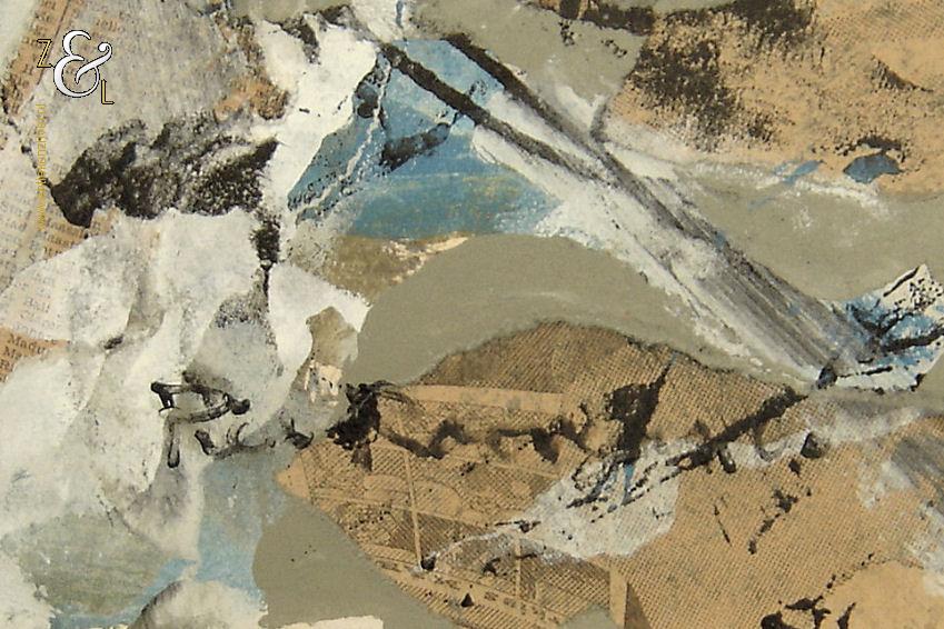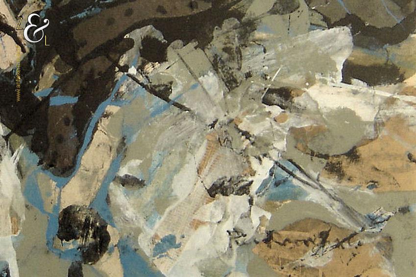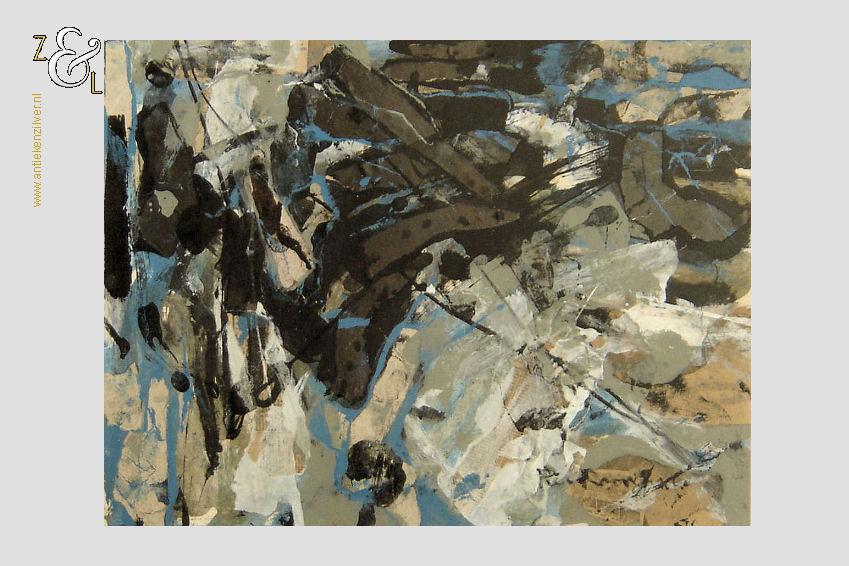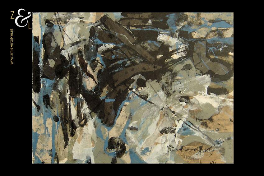 Deze collage is gemaakt door de Rotterdamse kunstenaar Piet Roovers. Het kunstwerk dat in de abstracte stijl is vervaardigd is rechtsonder met zwarte verf gesigneerd en gedateerd Piet Roovers ’60. De collage is aan de binnenzijde van het passe partout gemeten 47 cm lang bij 35.3 cm breed, de buitenzijde van het passe partout is 69.8 cm lang bij 60 cm breed.