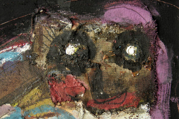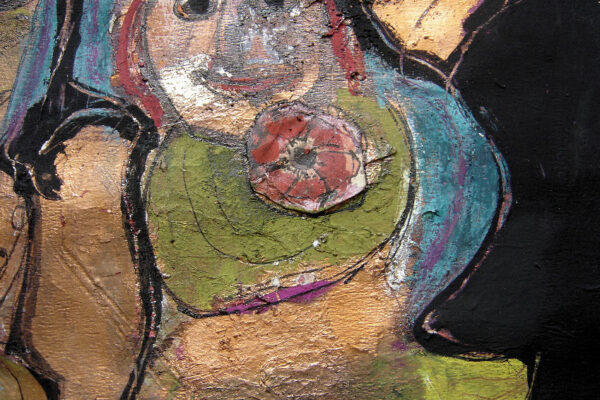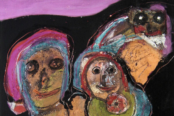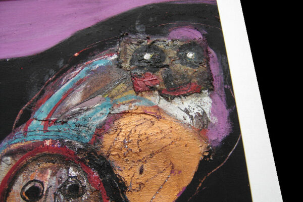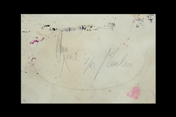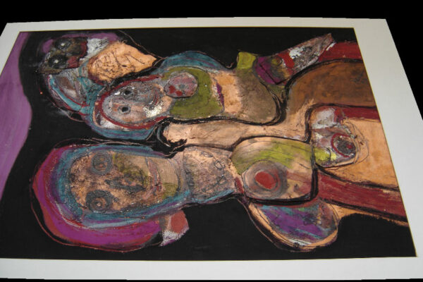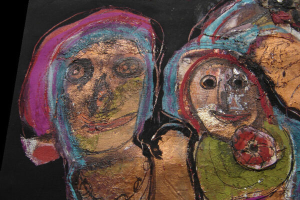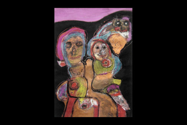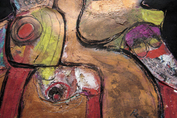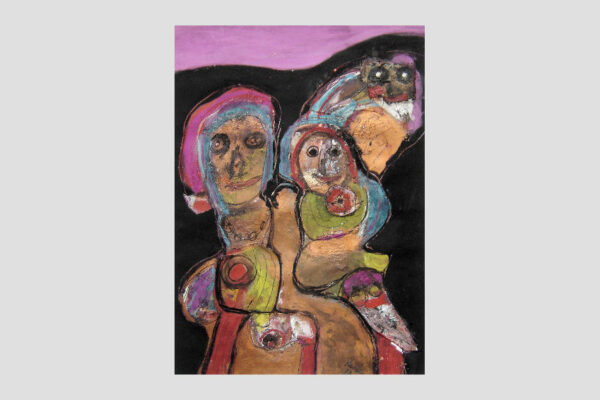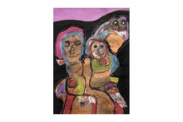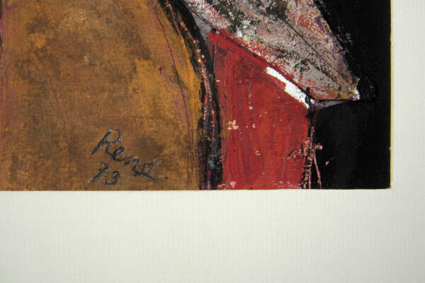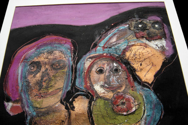 Deze collage / gemengde techniek is gemaakt door de Beverwijkse kunstenaar René van der Meulen. Het kunstwerk waarop drie figuren, een vrouw, kind en uil zijn afgebeeld is in de figuratieve / abstracte / expressieve stijl vervaardigd. Het kunstwerk is in potlood gesigneerd en gedateerd met aan de voorzijde rechtsonder René 73 en aan de achterzijde met René v/d Meulen in ovaal. De collage is aan de binnenzijde van het passe partout gemeten 71.5 cm lang bij 52 cm breed. De buitenzijde van het passe partout is 83.7 cm lang bij 59.2 cm breed.