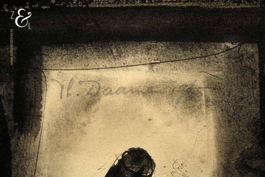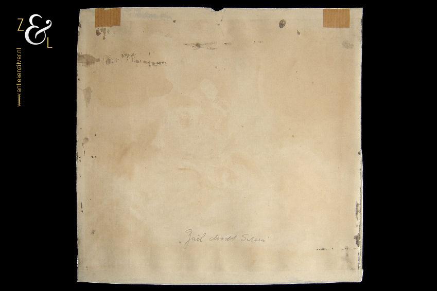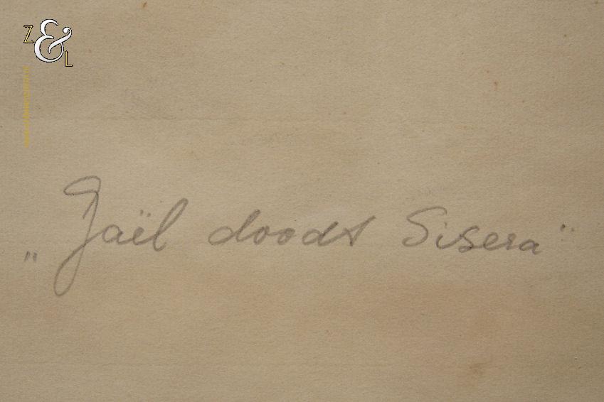 Deze gewassen inkttekening met de titel “Jaël doodt Sisera” is gemaakt door Theo Daamen. De gewassen inkttekening is in het midden van de afbeelding aan de bovenzijde van de deuropening in potlood gesigneerd en gedateerd: Th. Daamen 1965. Tevens staat op de achterkant van de gewassen inkttekening in potlood de titel “Jaël doodt Sisera” geschreven. De gewassen inkttekening heeft rondom een randje van tape waarmee Theo Daamen het kunstwerk heeft vastgezet en aan de bovenzijde mist in het midden een stukje (van een punaise?). Het kunstwerk is aan de buitenkant gemeten 37.5 cm lang bij 36.5 cm breed en aan de binnenkant van de tape is de afbeelding 35.5 cm lang bij 34.5 cm breed.